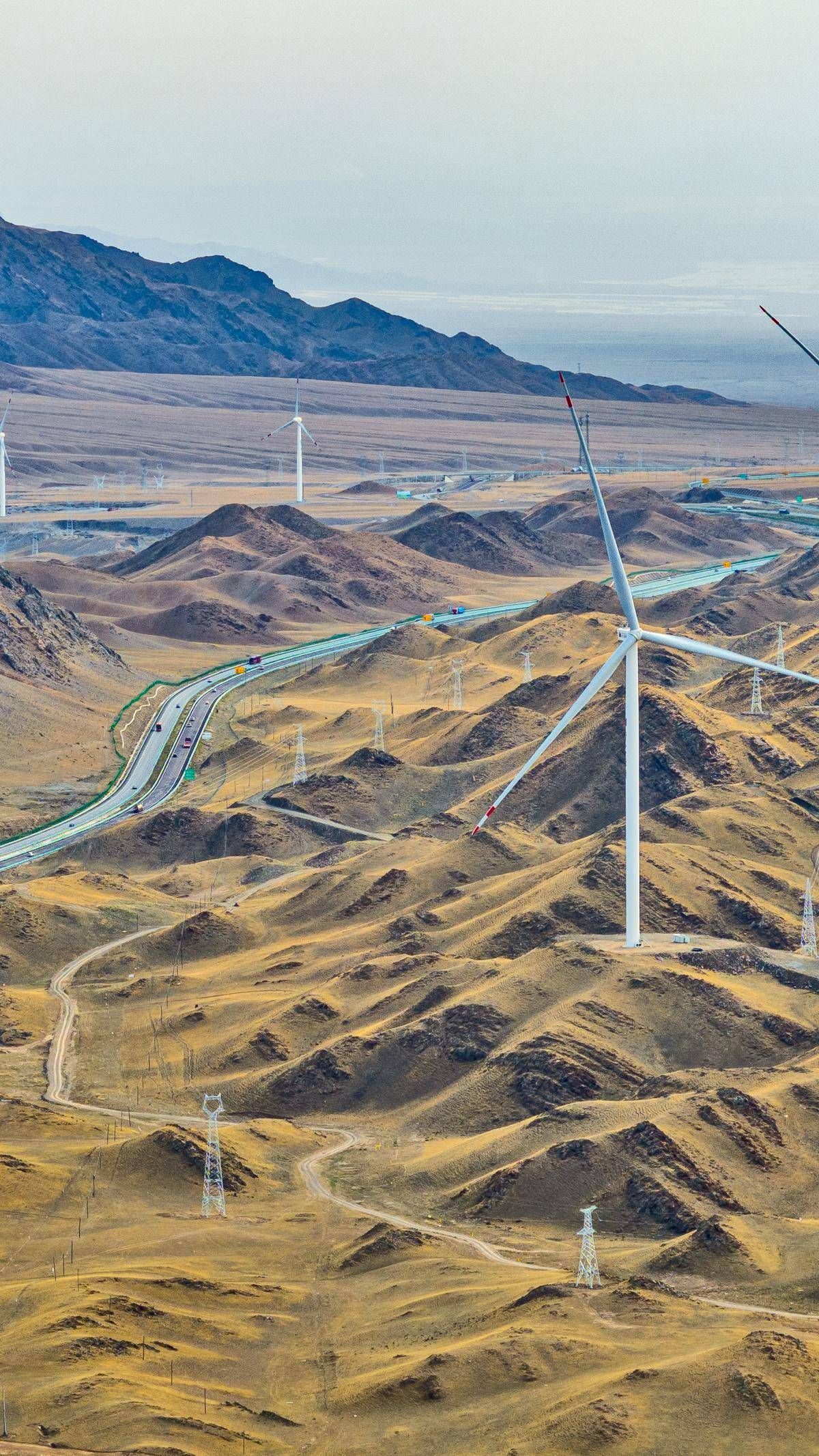 9月14日,通往赛里木湖的公路两边,随处可见“中国三峡”字样的风力发电机组。