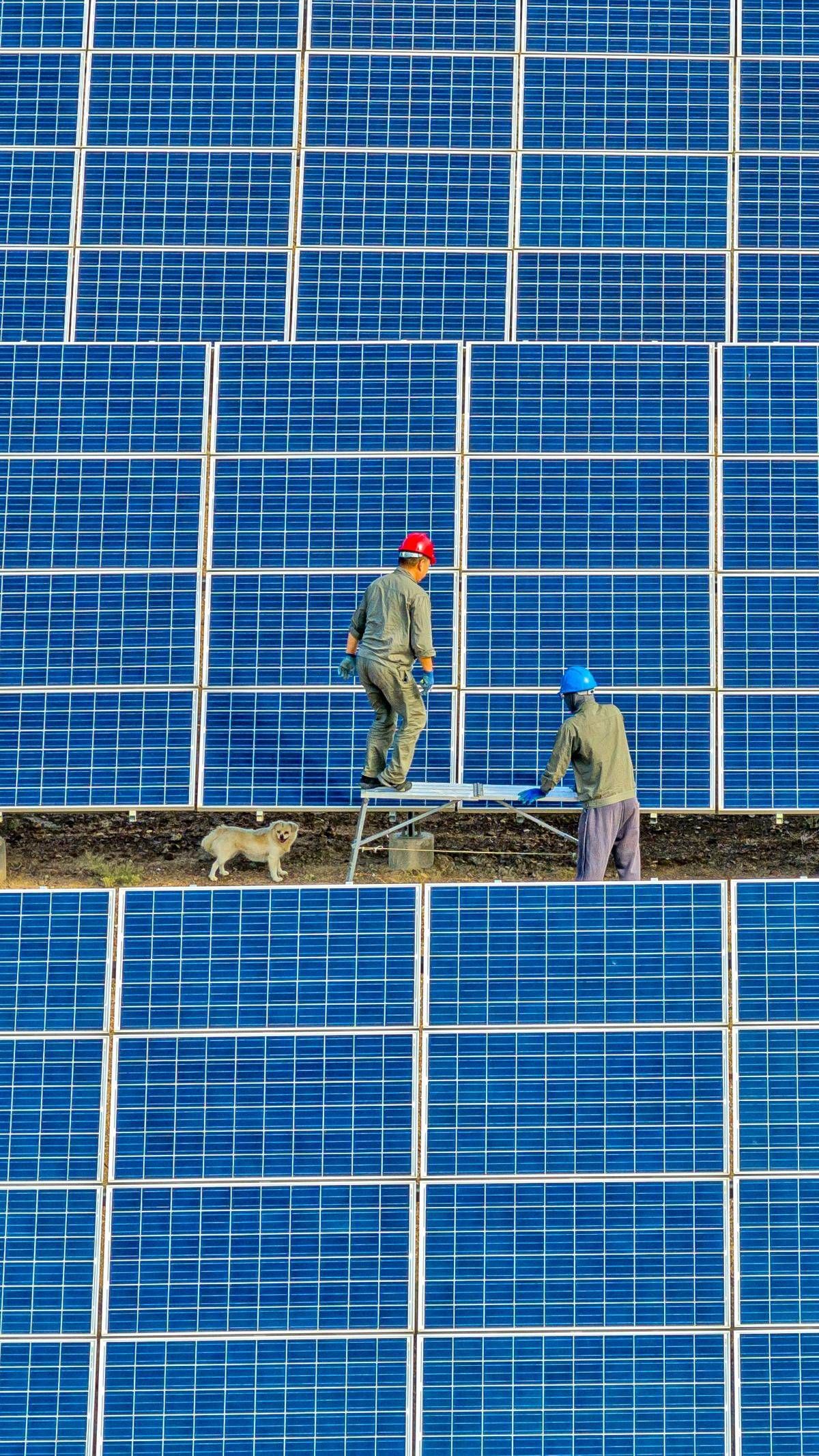 9月13日,东贝洁能光伏发电项目员工正在对光伏板进行巡检,这是湖北援疆项目,过去的戈壁变成清洁能源的基地。