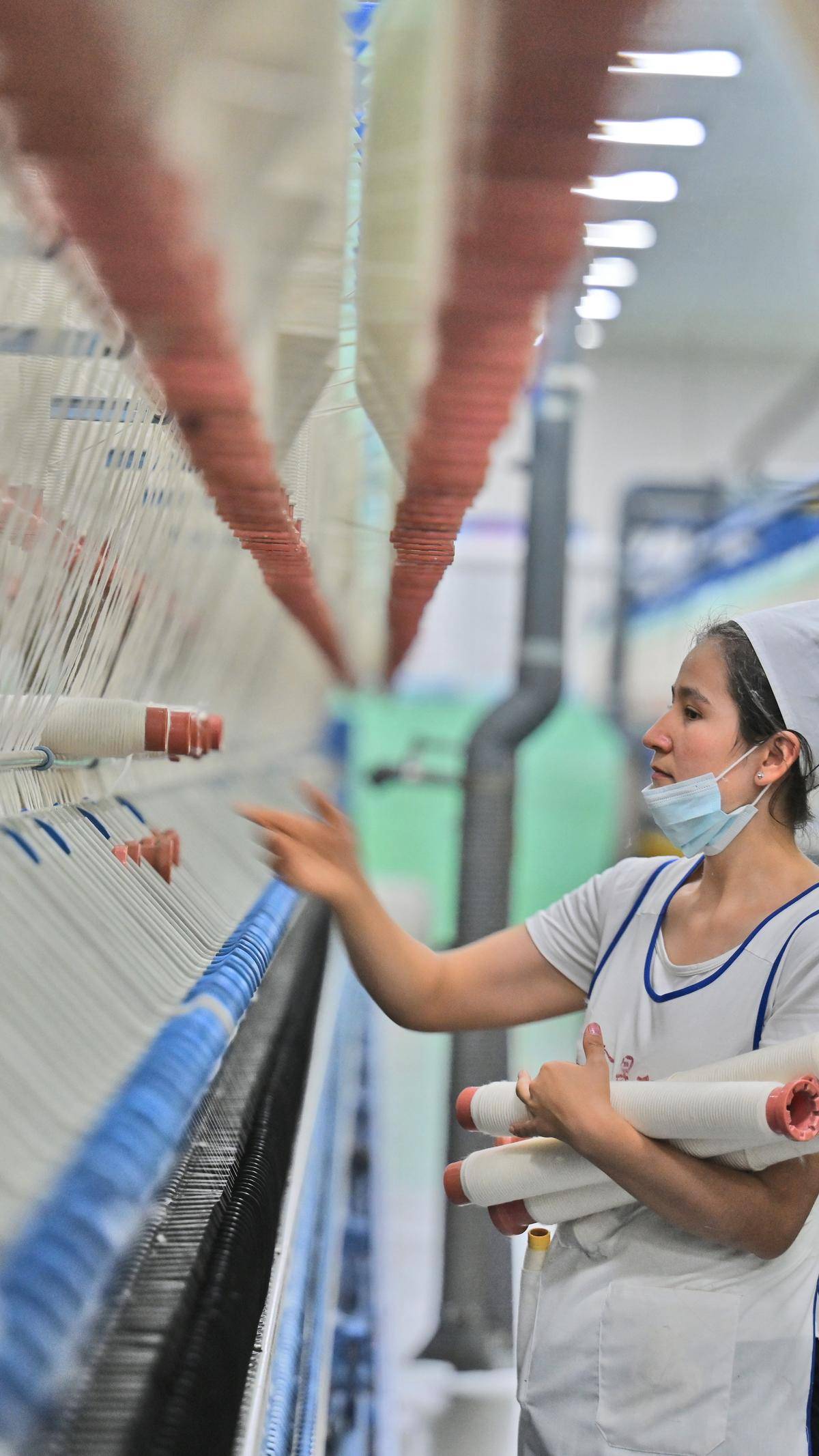 9月12日,新疆金鑫昱纺织有限责任公司员工正在忙生产。近期,湖北孝棉实业集团投资建设的金鑫昱二期20万锭纺织项目一期10万锭建设接近尾声,设备陆续进入厂房,将进行安装调试。