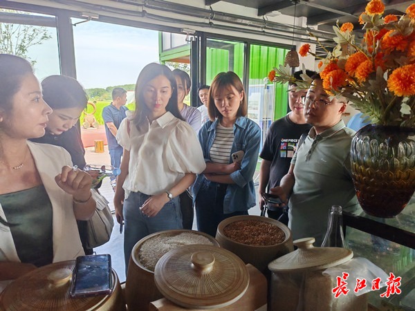 记者们了解江夏区农产品。 记者唐婧妮 摄