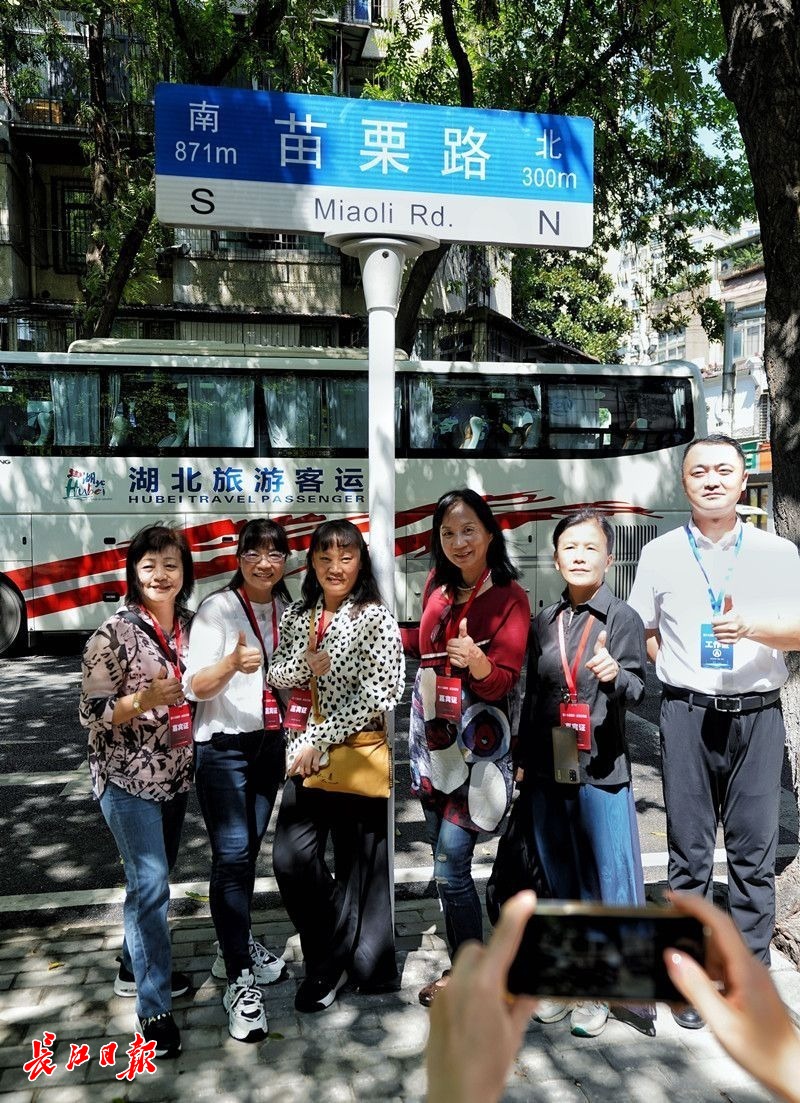 台湾苗栗县客人在武汉苗栗路路牌前合影。记者肖僖 摄