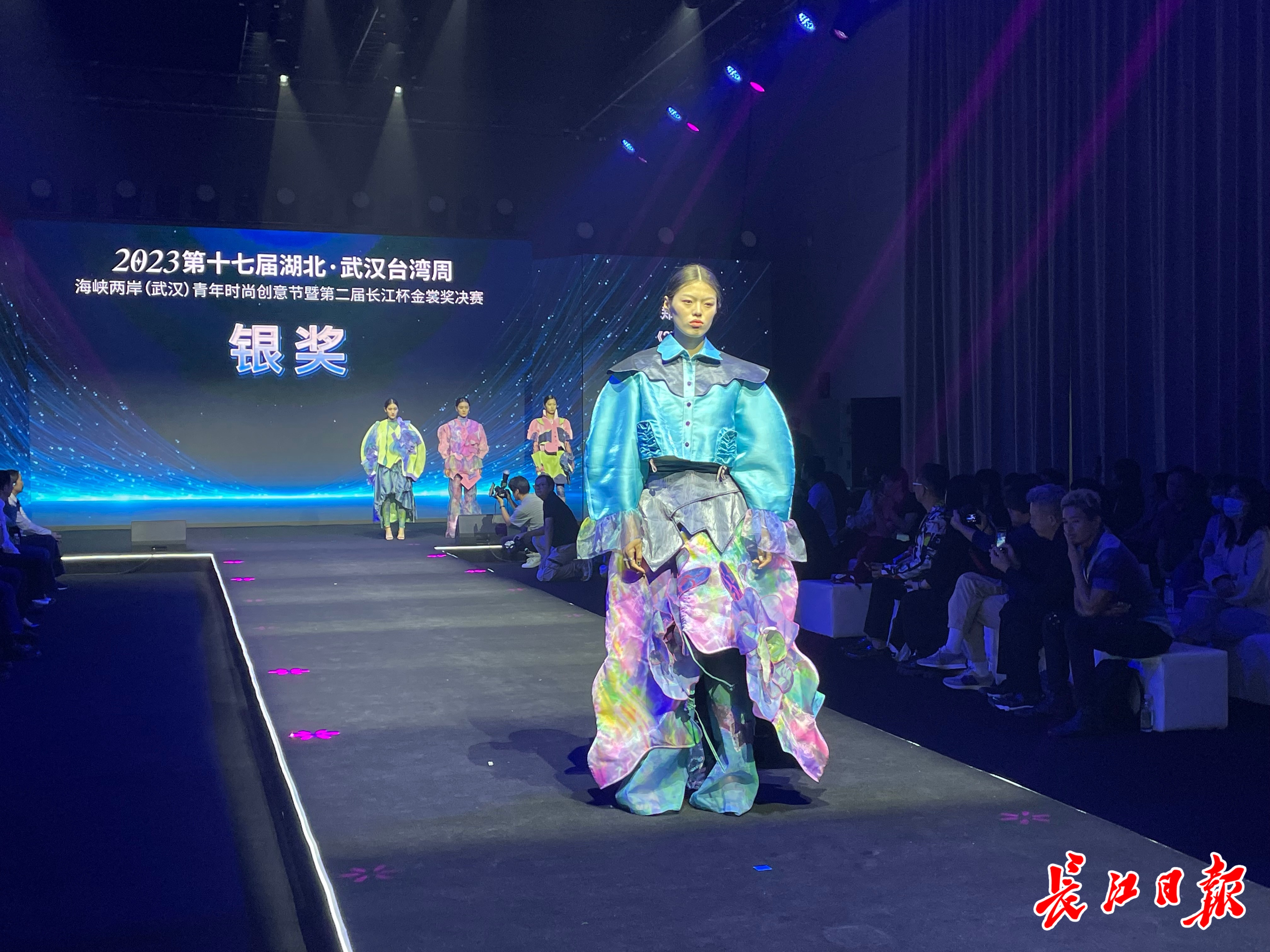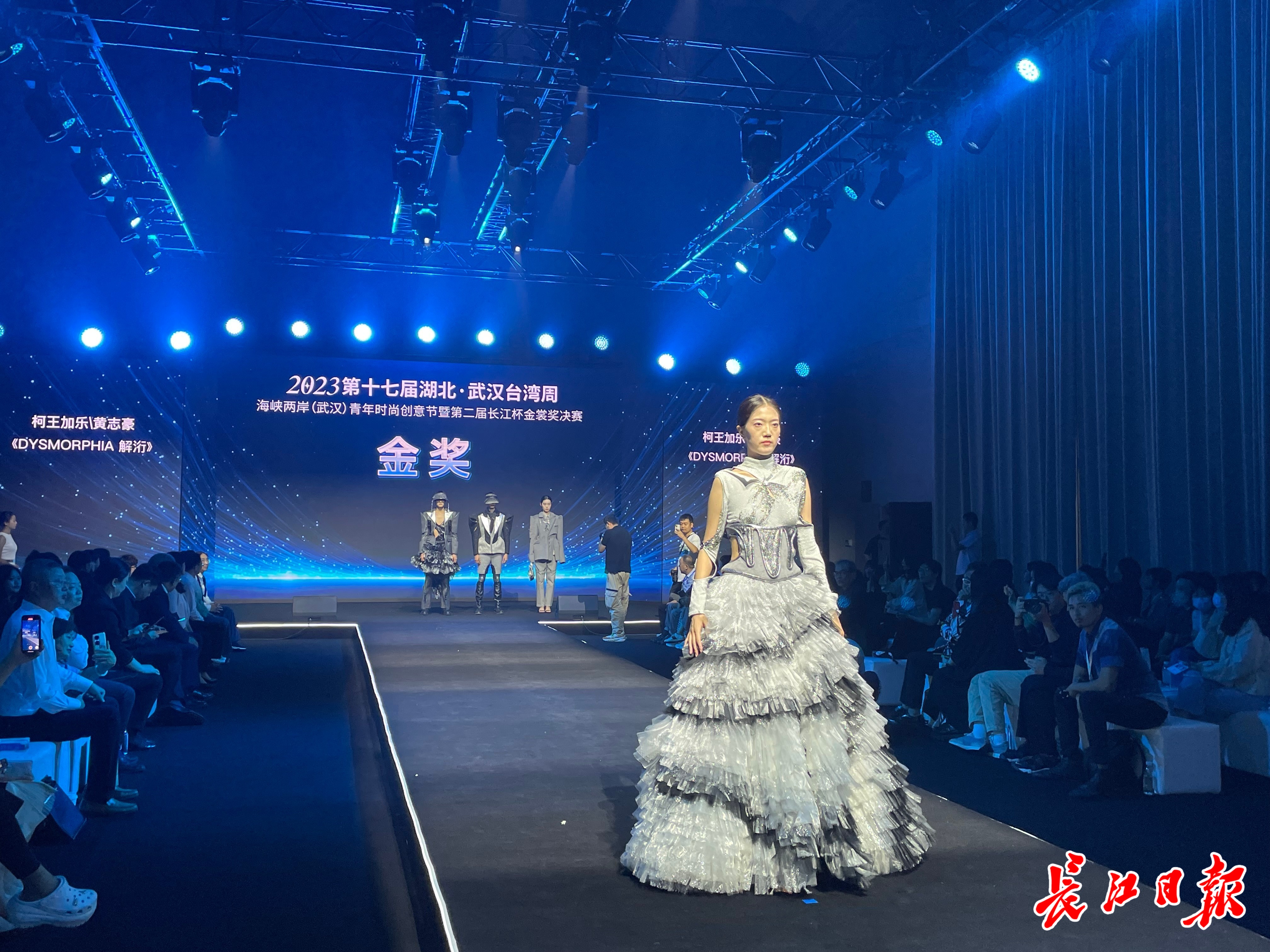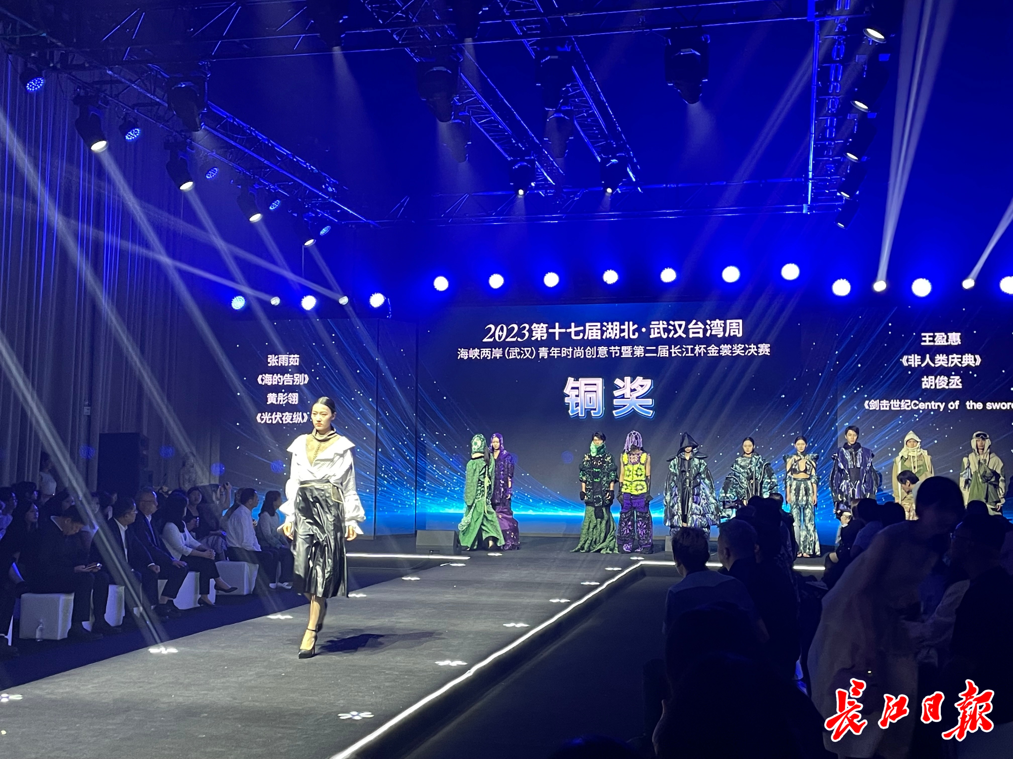决赛现场,来自台湾亚洲大学、辅仁大学、实践大学、树德科技大学、岭东科技大学、万能科技大学、玄奘大学、台北海洋科技大学等8所高校,以及湖北美术学院、武汉纺织大学服装学院、江汉大学设计学院等武汉3所高校的近百名青年学生代表齐聚一堂,在T台上同台展演、相互交流、比拼创意。
