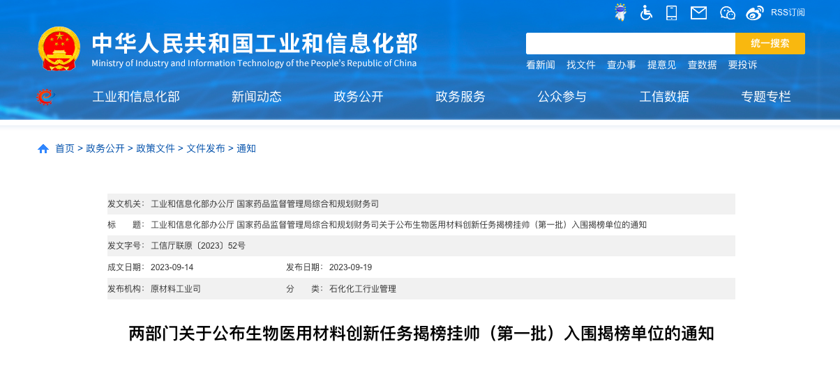 生物医用材料创新任务揭榜挂帅(第一批)入围揭榜单位具体名单如下:
