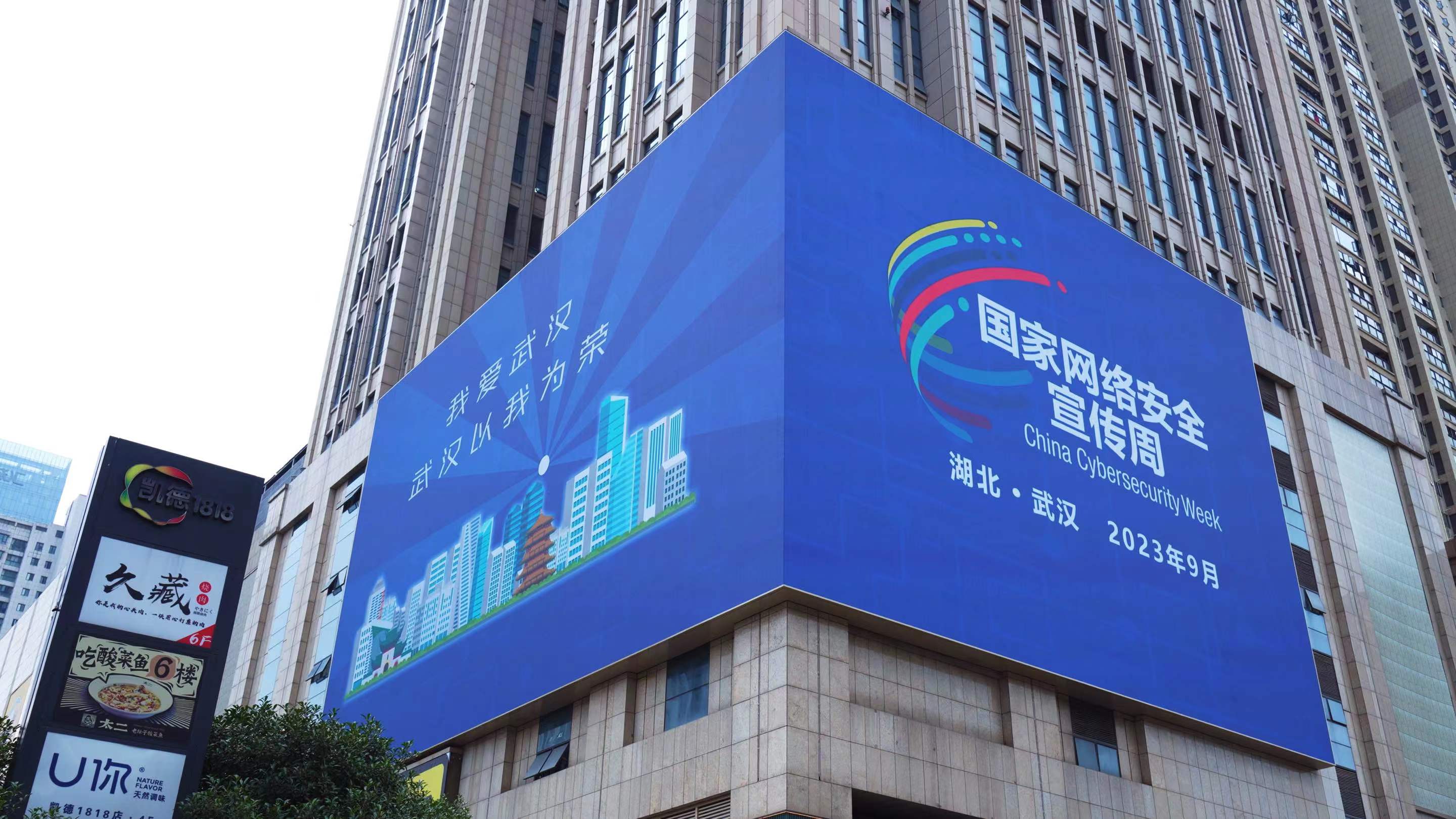 据市委网信办相关负责人介绍,网络安全主题长江灯光秀是2023年武汉市国家网络安全宣传周的一大新亮点。此外,“七屏”联动更加深入人心。它利用广播电视、手机终端、岚图智能网联汽车等各种媒介,通过开屏视频、视频彩铃等方式,展示网安周主题海报并播放主题宣传片。核心商圈的户外LED大型屏幕、室内反电诈宣传机,以及地铁电视和公交站点的显示屏,全天滚动播放网络安全和网络文明公益视频,网络安全宣传覆盖数亿人次。