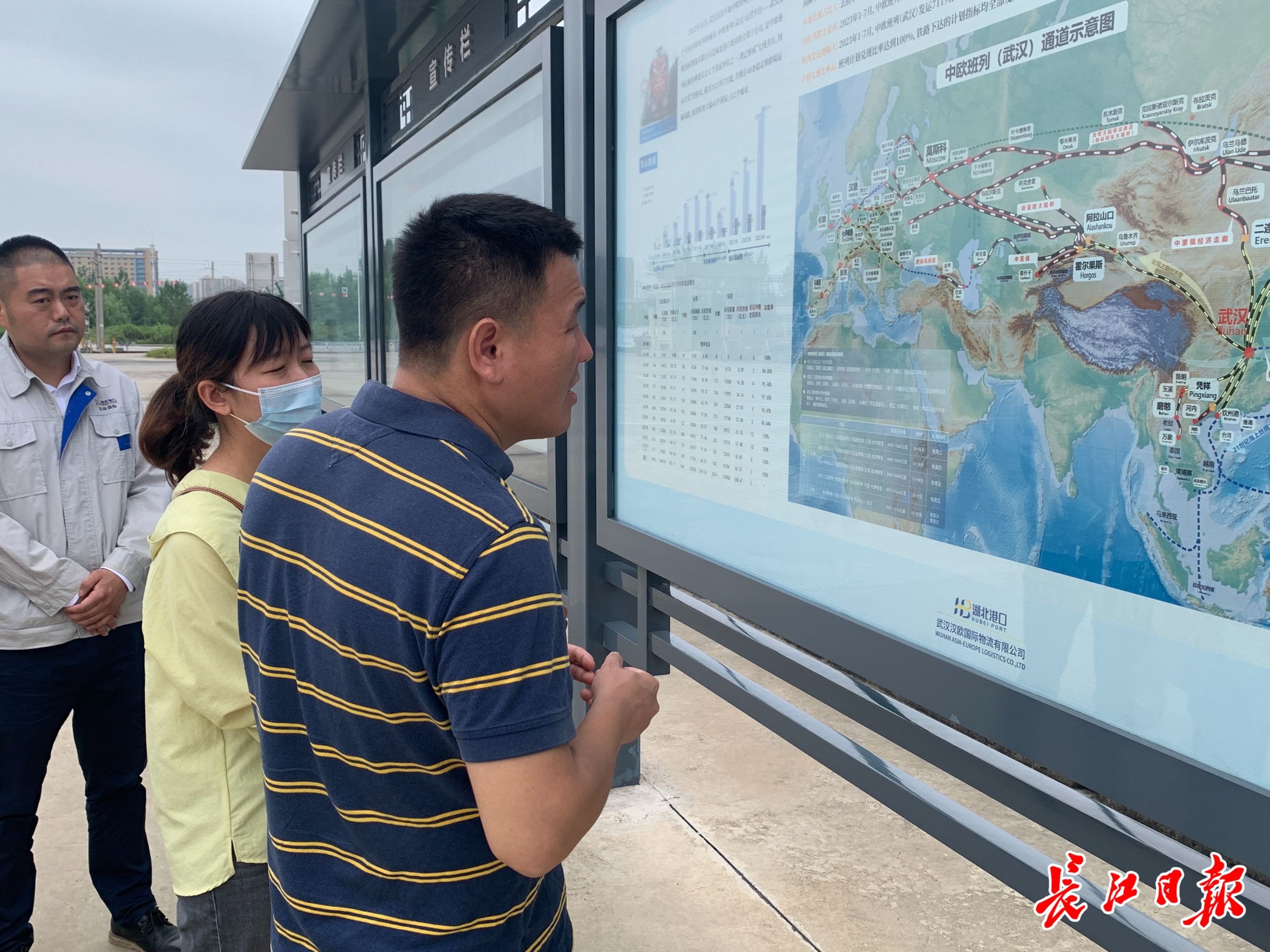 人民日报评论部政论研究室主编李拯看“中欧班列(武汉)通道示意图”。记者余睿 摄