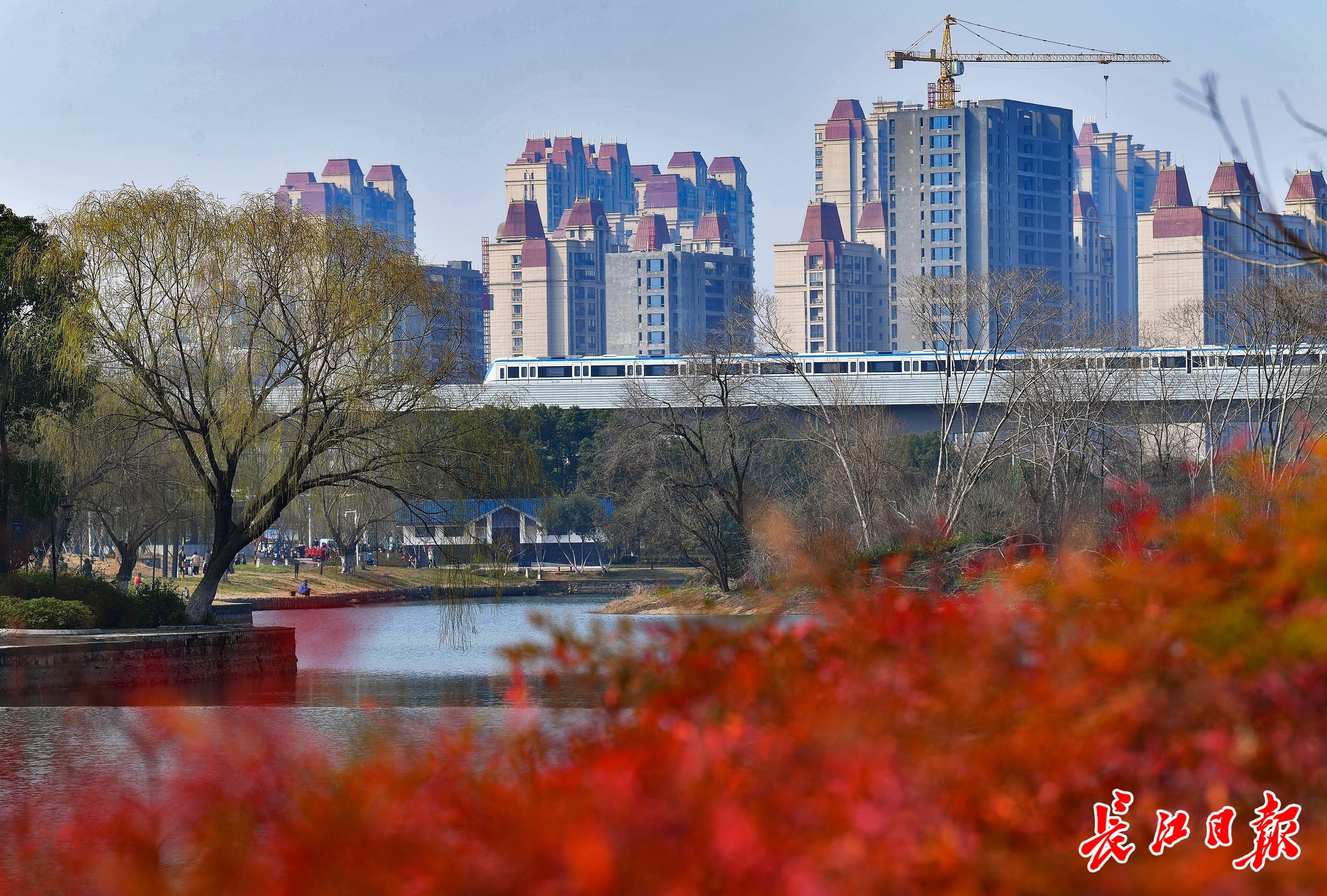 武汉市东西湖区码头潭公园,透过满树繁花,看到地铁驶过。长江日报记者 李永刚 摄