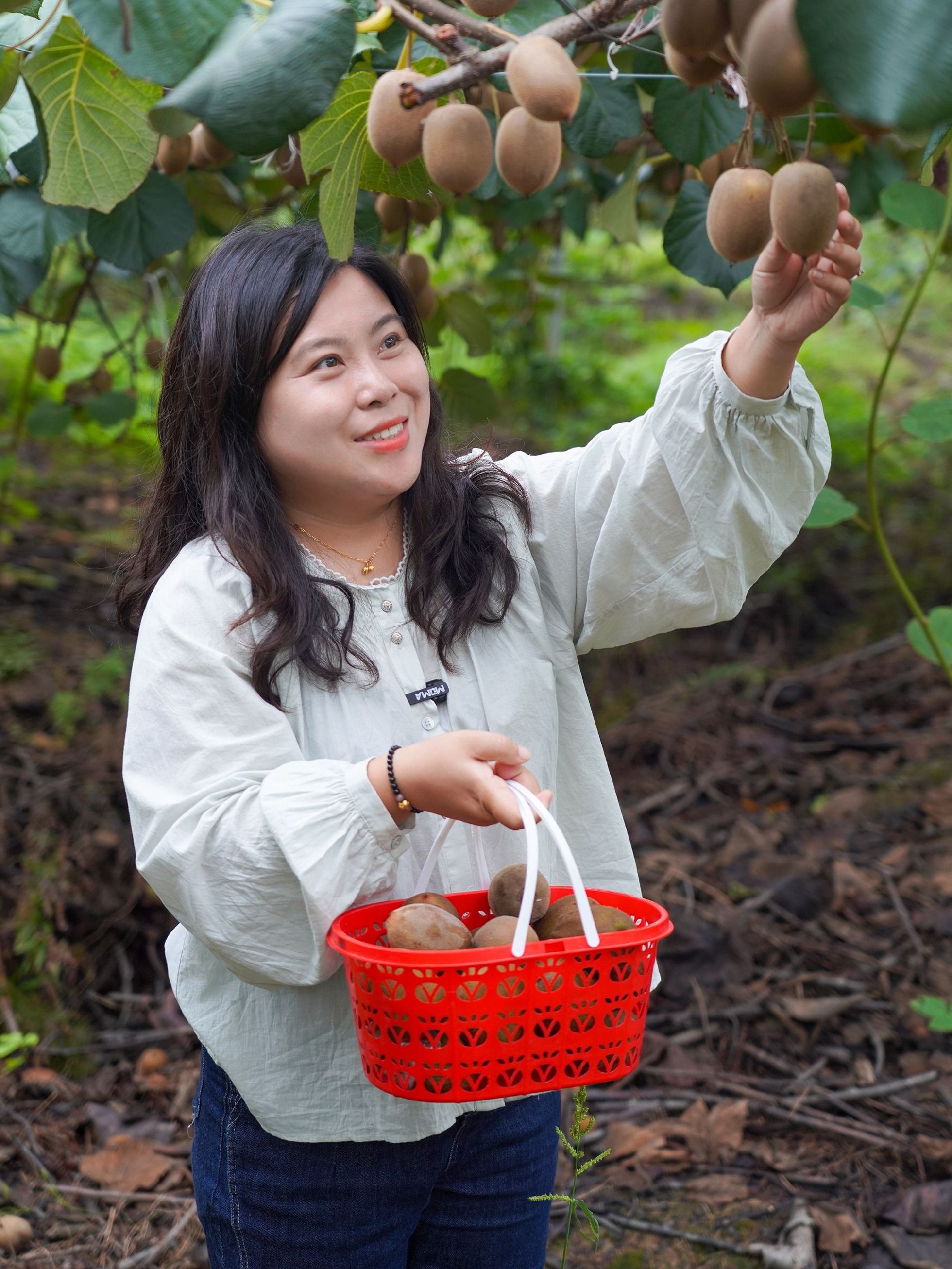 “90后”农业职业经理人邱诗情正在采摘猕猴桃。新洲区融媒体中心 王林峰 摄