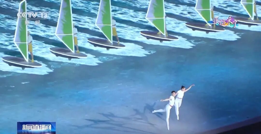 开幕式上,还将上演著名的《梁祝》双人舞,而且是在空中飞舞。据介绍,为了实现这个场景,亚运会开幕式首次在大型空间中使用3D双威亚技术。这套系统是为开幕式专门定制首创的,两位演员在“飞行”的过程中,每个人要被4根来自不同方向的钢丝牵拉,最快的‘飞行’速度接近了每秒4米。在系统运行当中,所有运行的绳索如果出现了摩擦或者碰撞,系统可以自动识别,自动停止,起到保护作用,大大提高在“飞行”表演过程中演员的安全性。