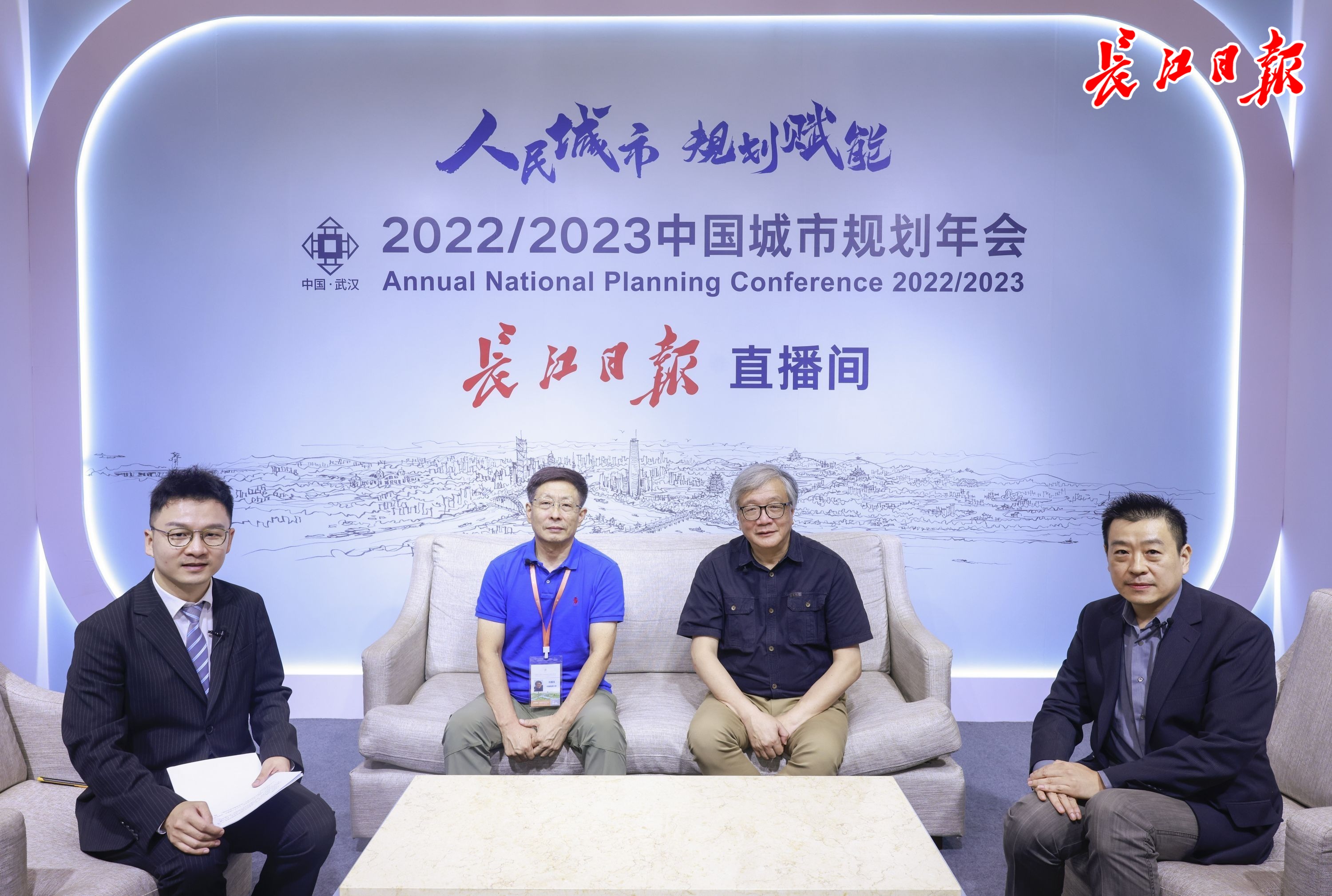 中国城市规划设计研究院原院长、教授级高工李晓江(右二),国家气候中心首席专家、教授任国玉(左二)以及华中农业大学园艺林学学院教授、博士生导师邵继中(右一)做客长江日报直播间。长江日报记者胡冬冬 摄