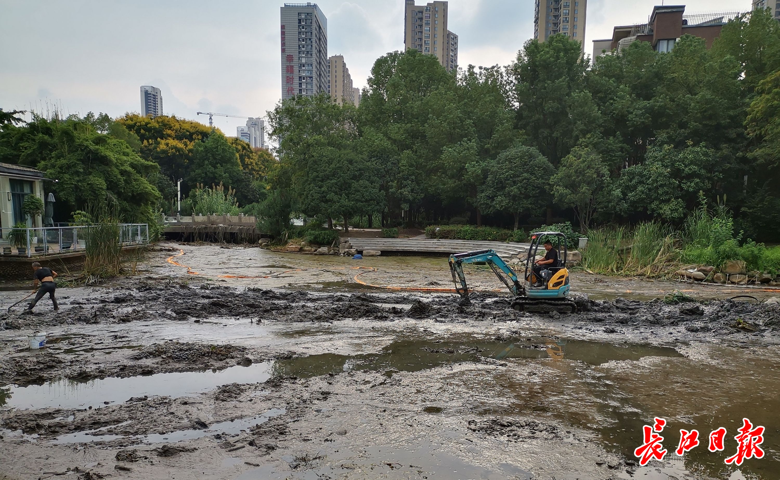 长江日报大武汉客户端讯 长江日报记者日前在江岸区后湖大道世博园小游园看到:景观池中,污黑的淤泥被挖机一铲铲挖起;沟渠中,工人们将黑臭的杂物装入编织袋中。