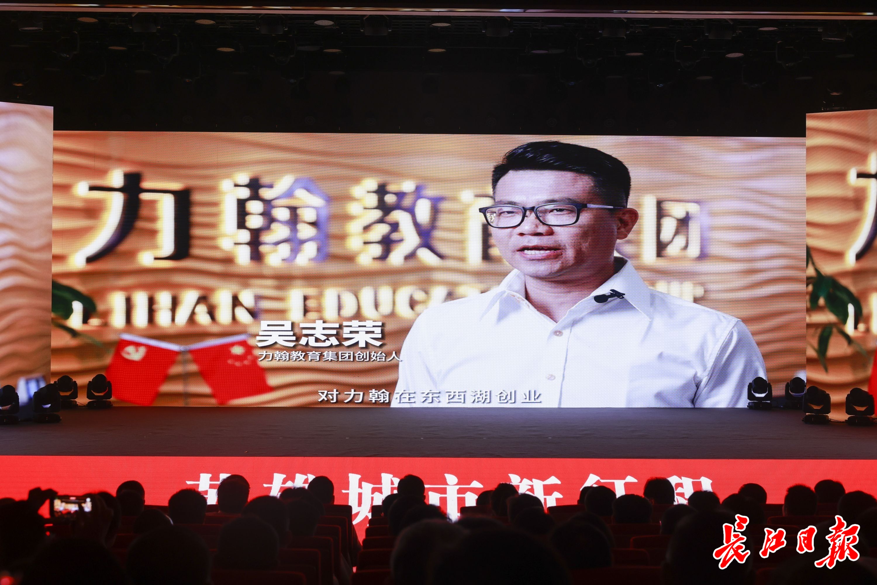 台资企业力翰教育集团董事长吴志荣在报告会的《企业家访谈》环节,向现场观众讲述在东西湖的创业历程。 长江日报记者胡冬冬 摄