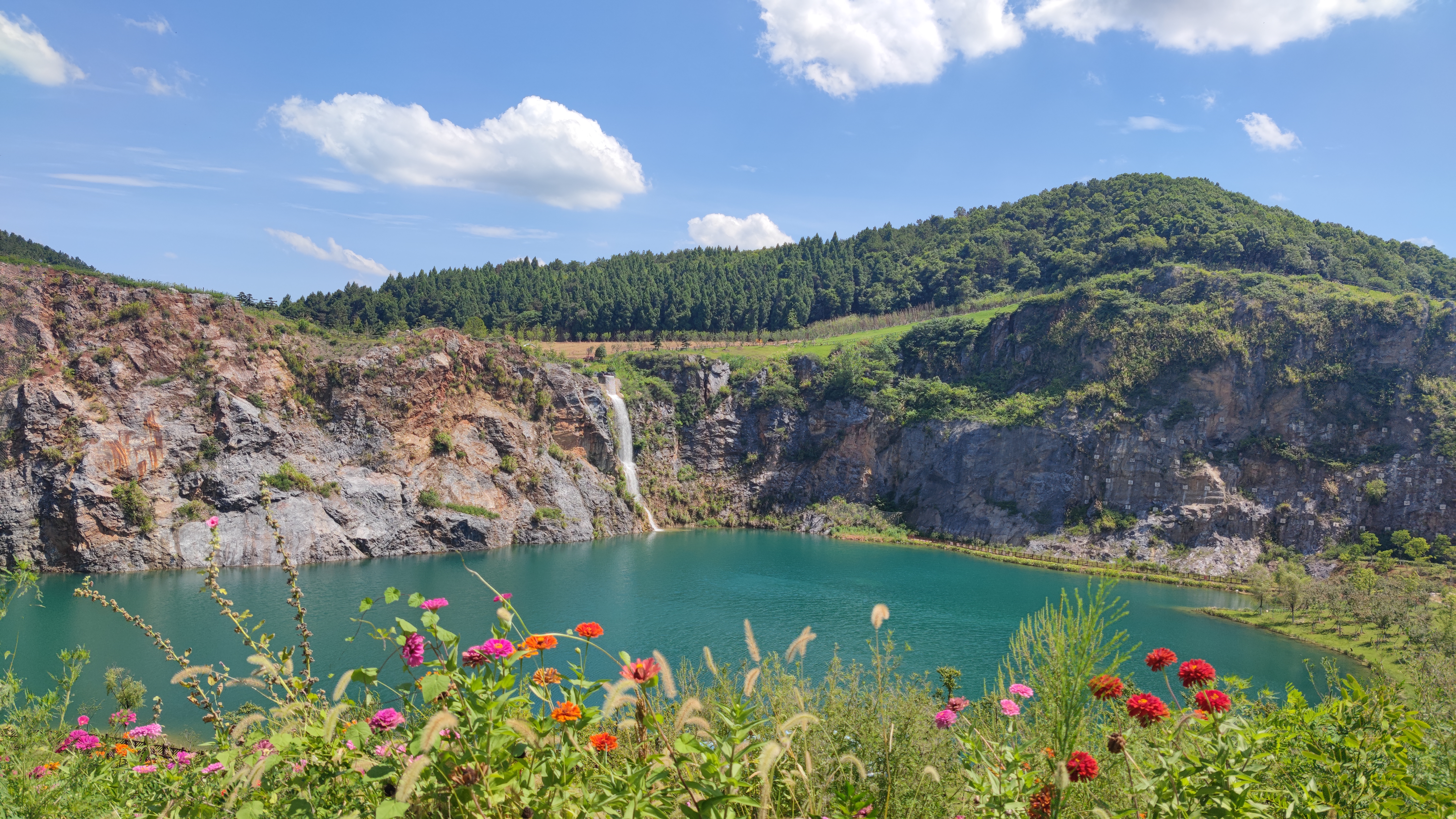 而行至山顶,高山草甸一望无垠,草地顺着山势起伏。俯瞰景区,绿如翡翠的矿坑湖则如同一面山间明镜,照亮了灵山各景。山间一道近50米高的瀑布飞流而下,激起层层浪花,远处的波斯菊、百日菊、向日葵花海、石林、采矿旧址尽收眼底。