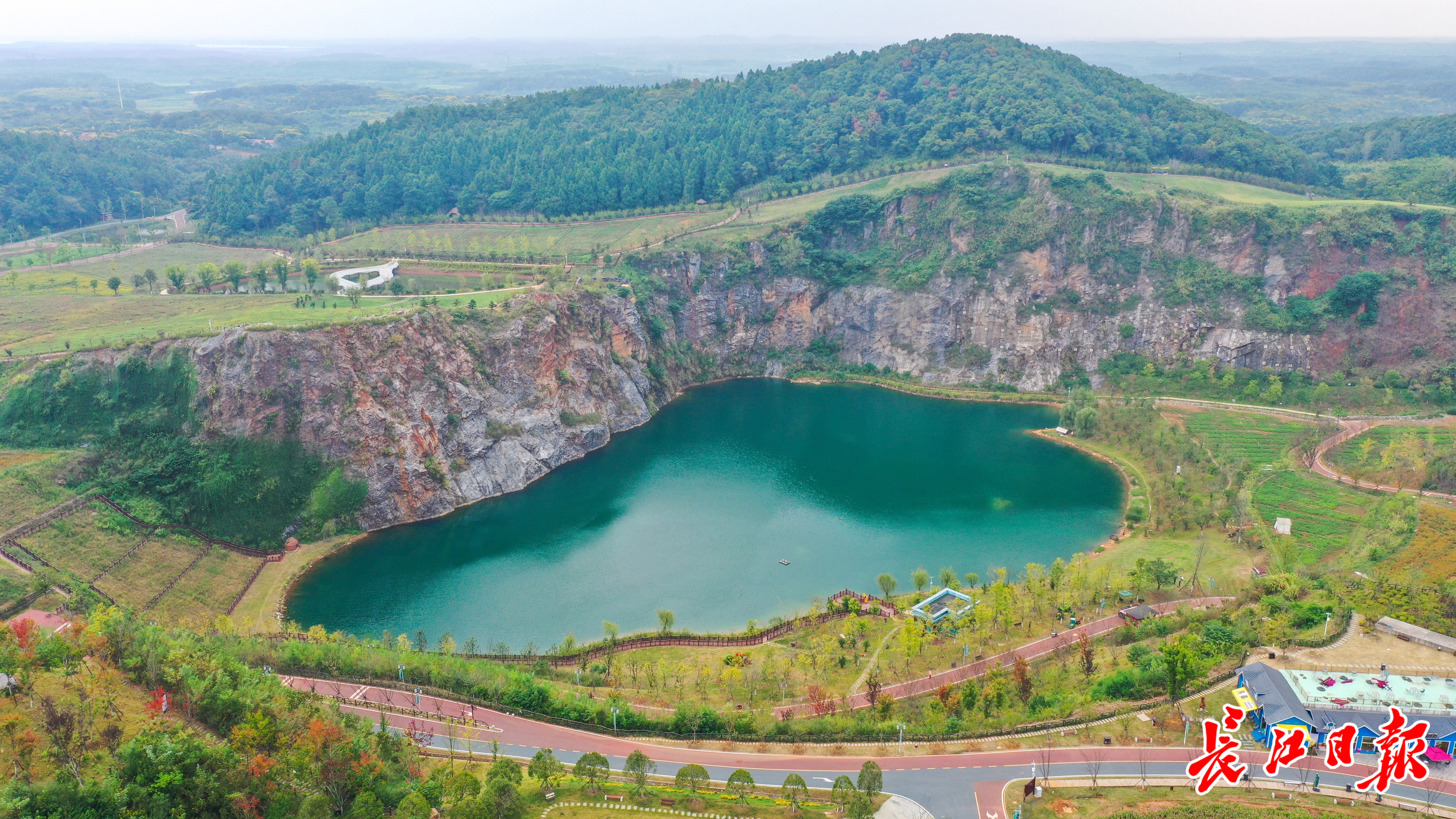 无人机镜头下,矿山采空区渗水聚成的小湖如同一块被镶嵌在山间的碧玉,澄澈而美丽。贵阳网记者吕京鸿说:“灵山是武汉市破损山体生态修复的一个成功案例。武汉将废弃的矿山变成了绿水青山,这些绿水青山也会成为武汉市民的金山银山。”