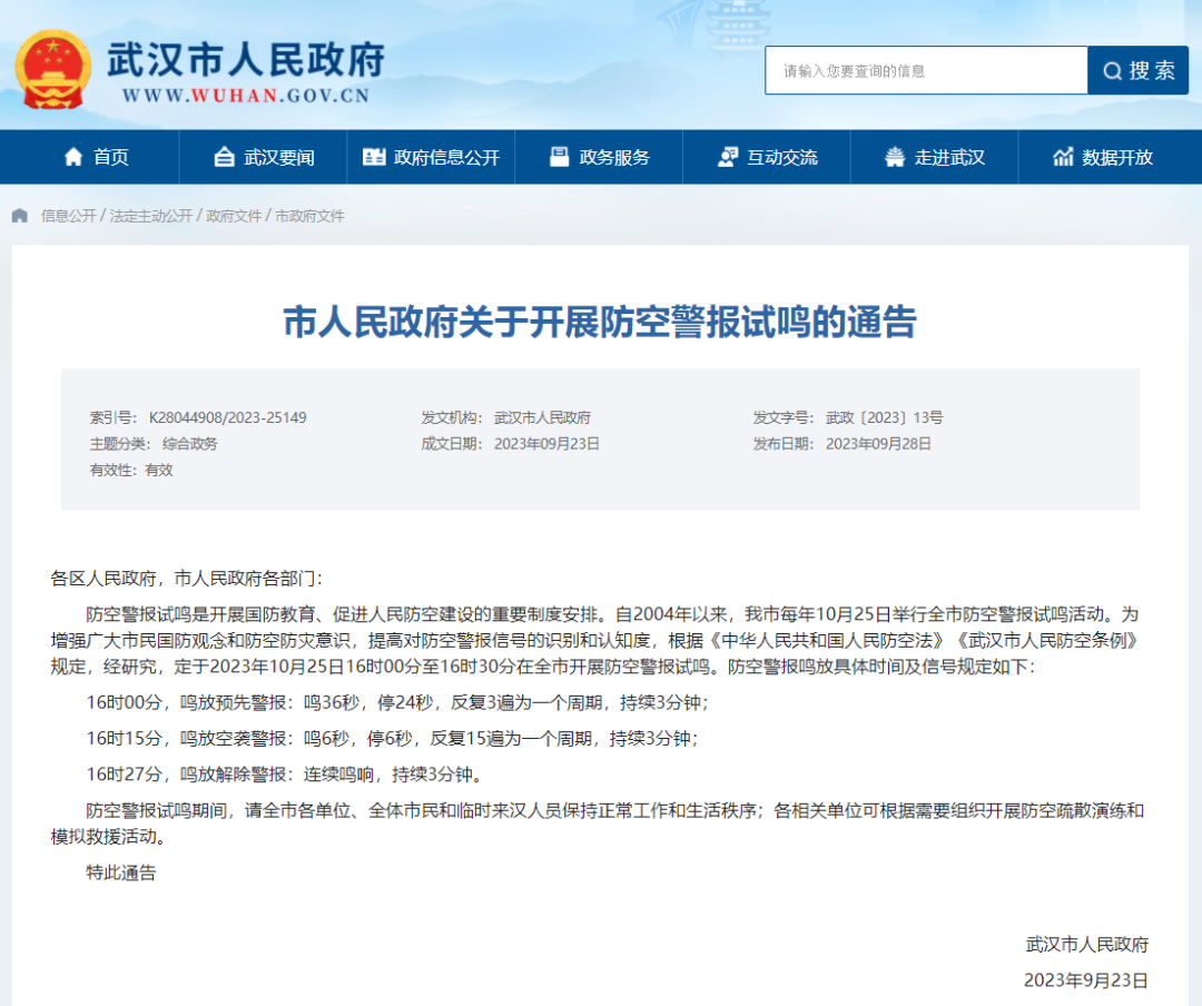 防空警报试鸣是开展国防教育、促进人民防空建设的重要制度安排。自2004年以来,我市每年10月25日举行全市防空警报试鸣活动。为增强广大市民国防观念和防空防灾意识,提高对防空警报信号的识别和认知度,根据《中华人民共和国人民防空法》《武汉市人民防空条例》规定,经研究,定于2023年10月25日16时00分至16时30分在全市开展防空警报试鸣。防空警报鸣放具体时间及信号规定如下: