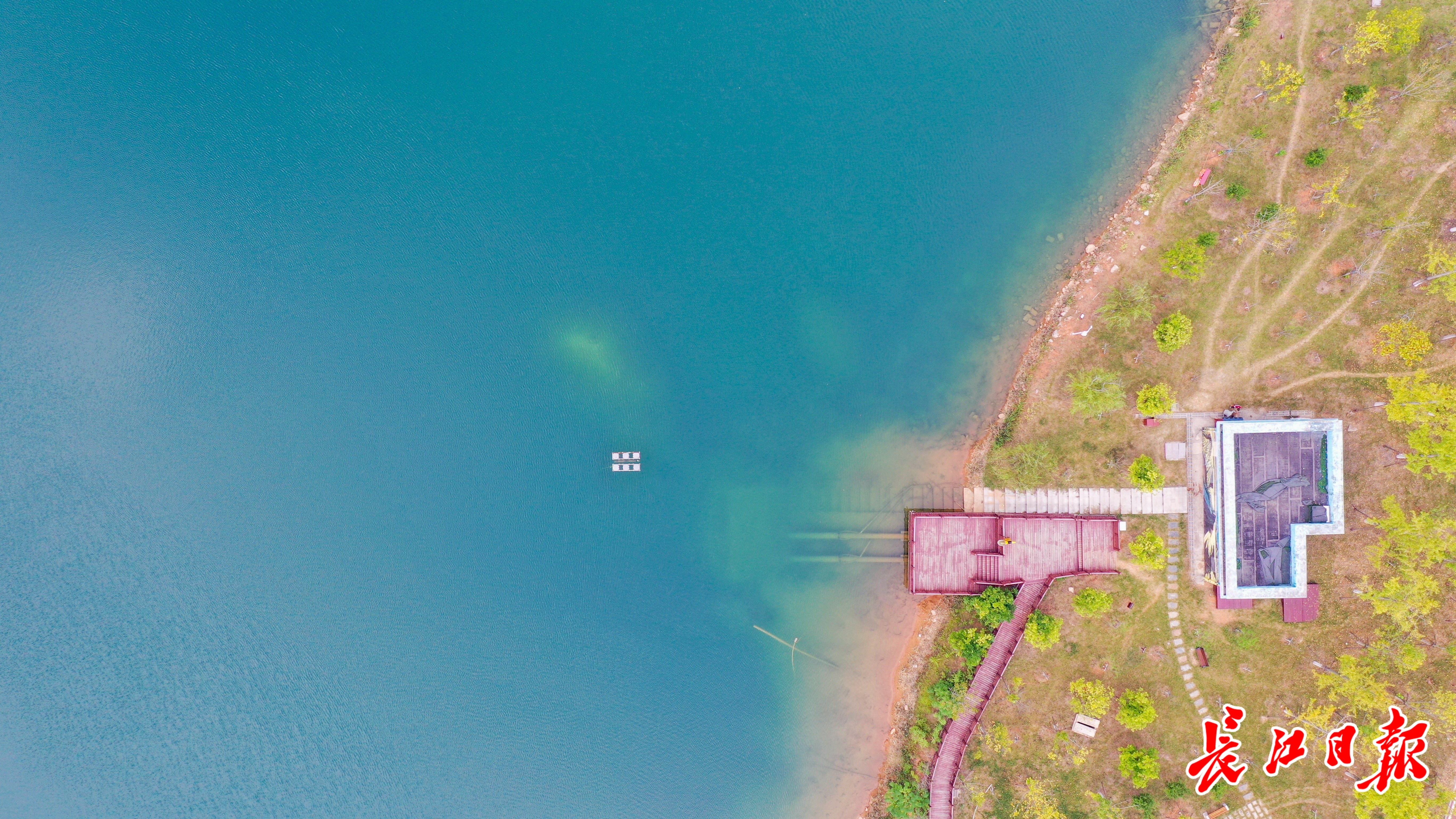 晴天时,梁子湖湖水呈现清澈、透亮的蓝色,景区打造的亲水平台可让人近距离观赏湖景。 长江日报记者吕诗文 摄