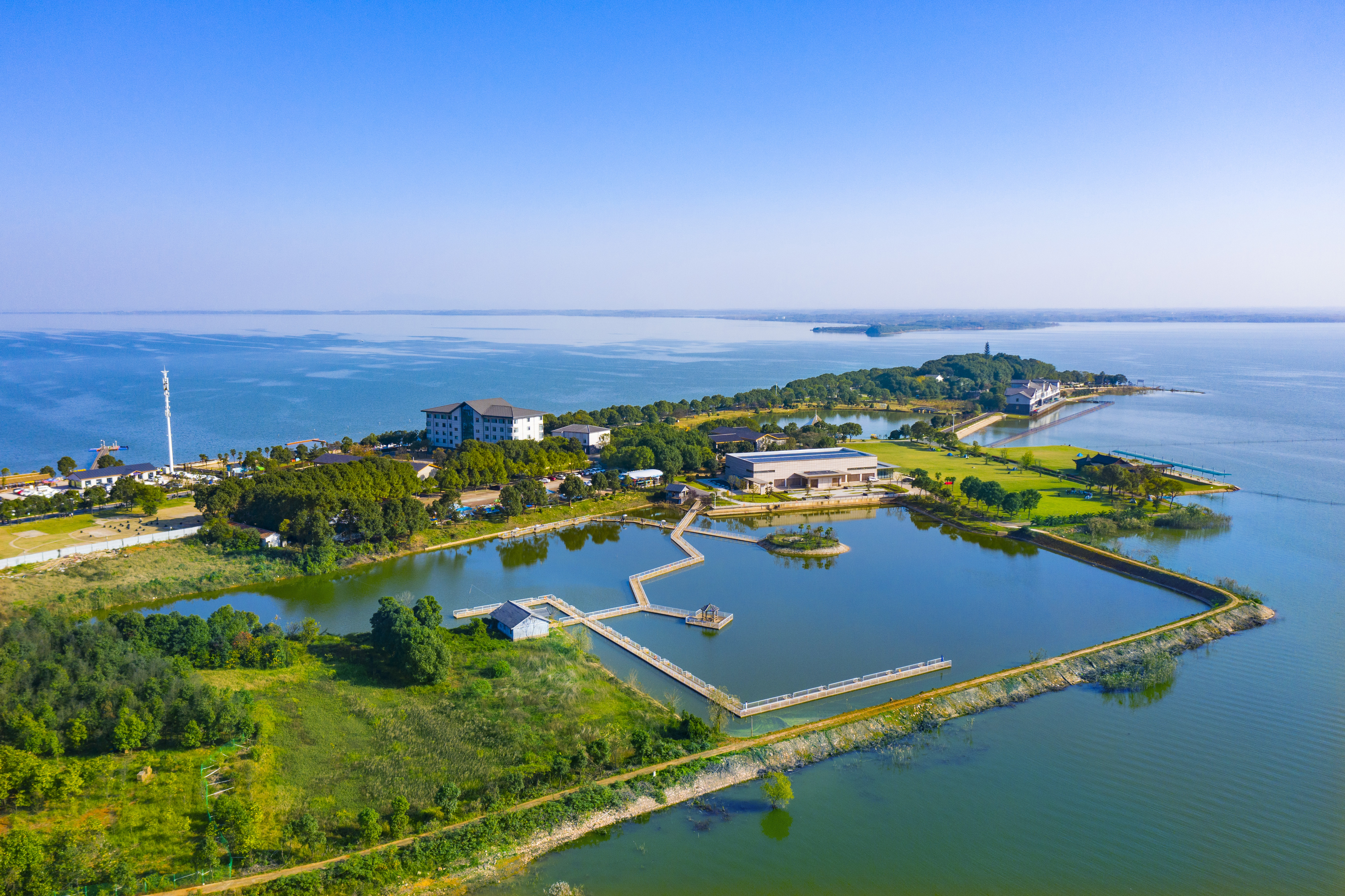 晴空下的梁子湖和梁子湖龙湾半岛风景区。 江夏区文化和旅游局 供图