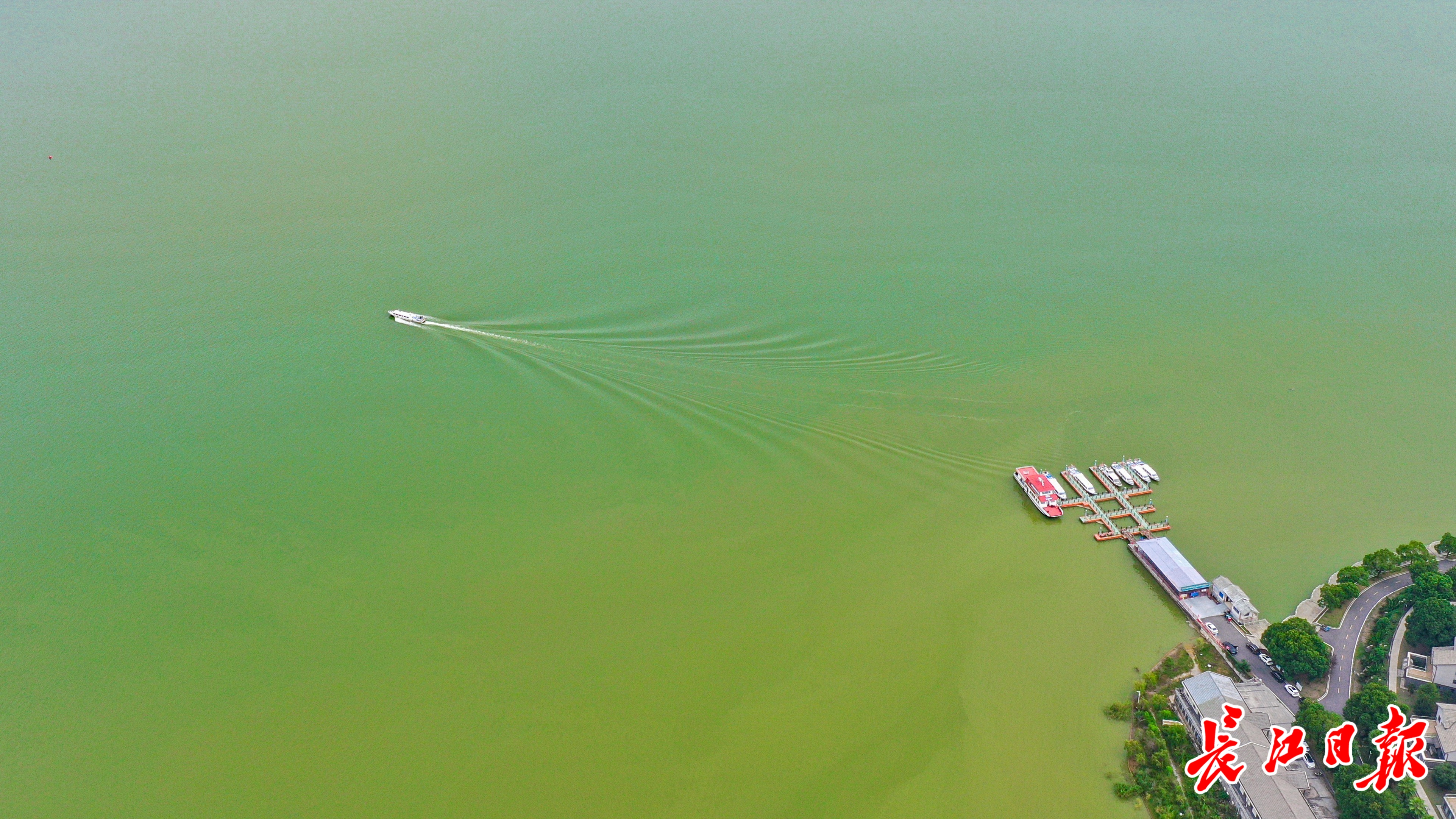 9月26日,梁子湖广阔清澈的湖面上,游船驶过划下一道白浪激起阵阵涟漪。 长江日报记者吕诗文 摄