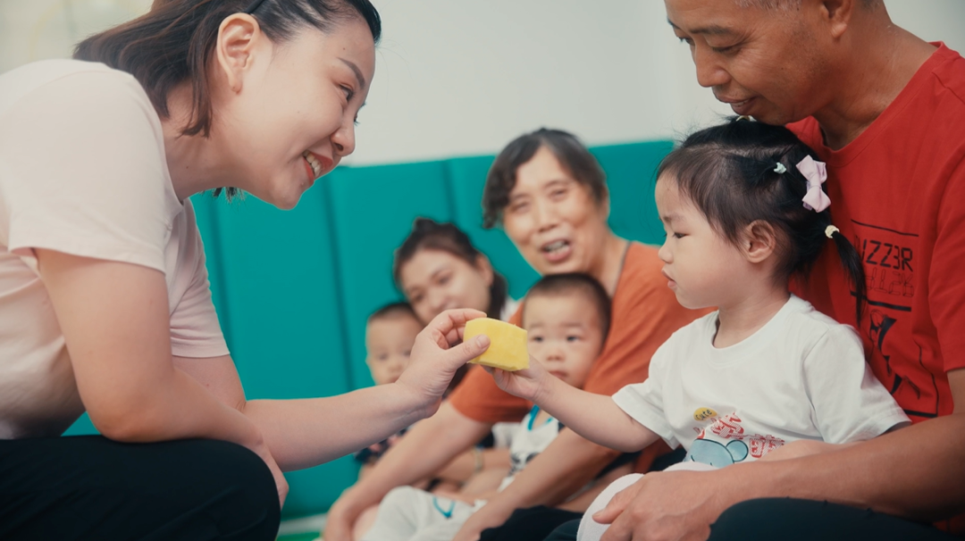 市计生服务中心婴幼儿早期发展中心的老师带着宝宝进行抓握能力训练。