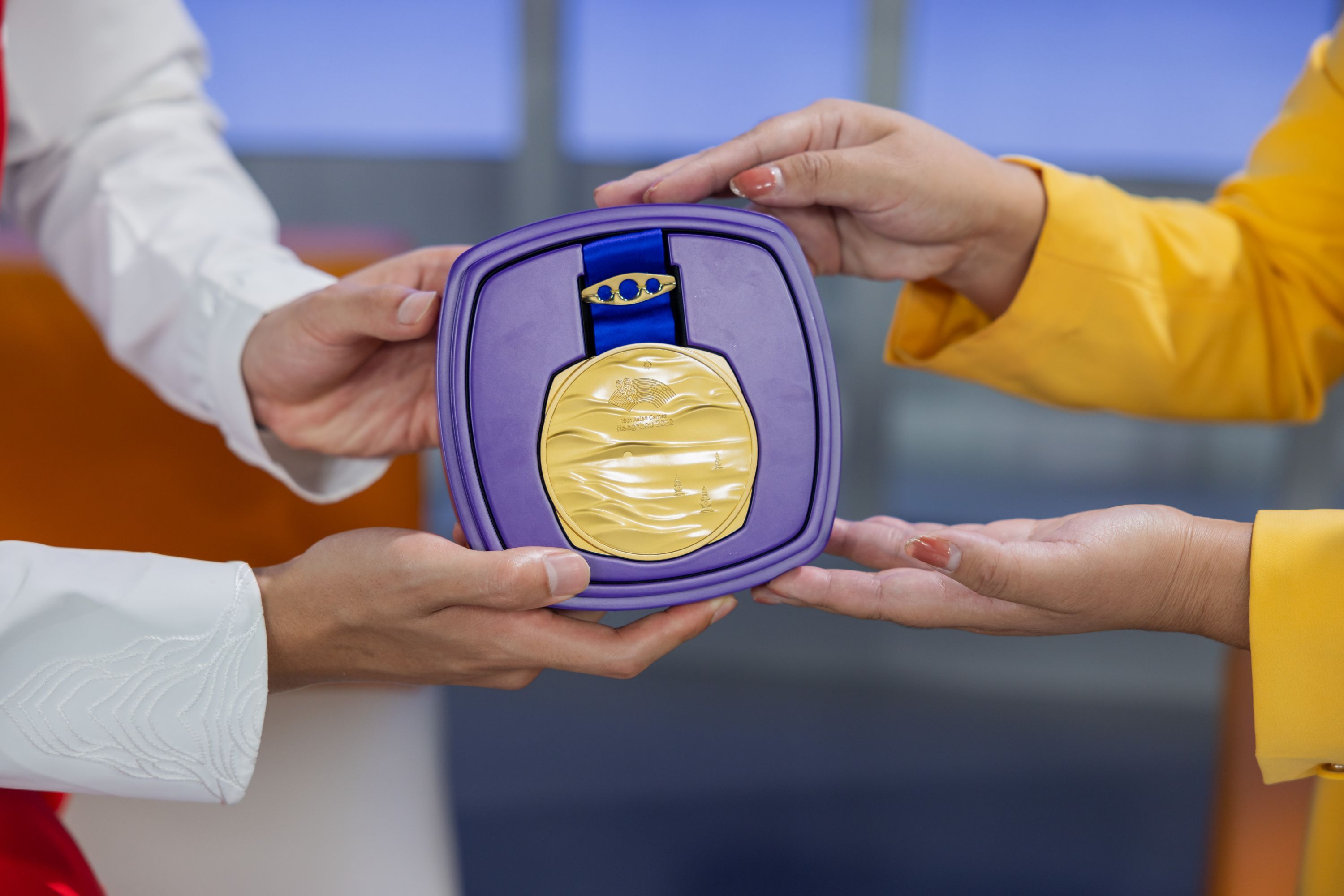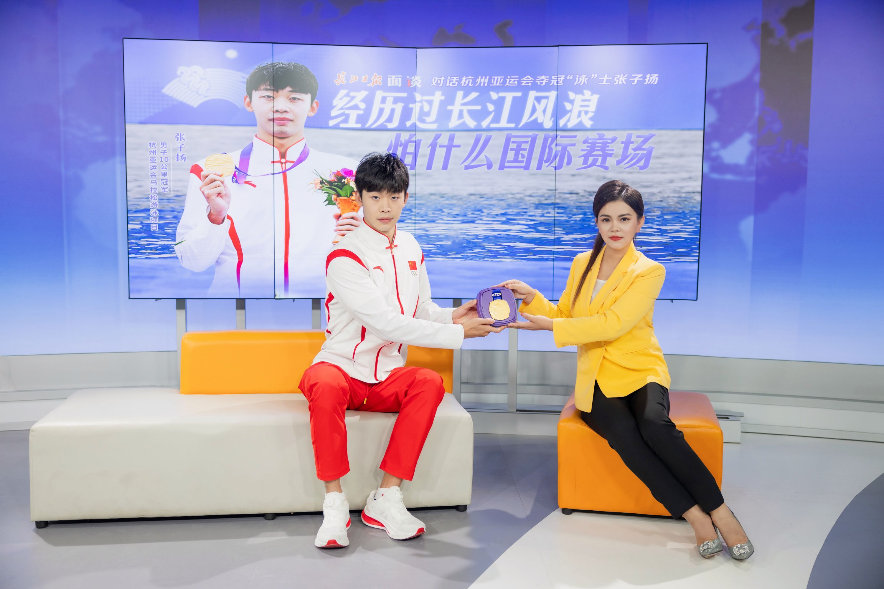 张子扬在《面谈》栏目展示亚运会金牌。摄影:演播中心 刘雍涛