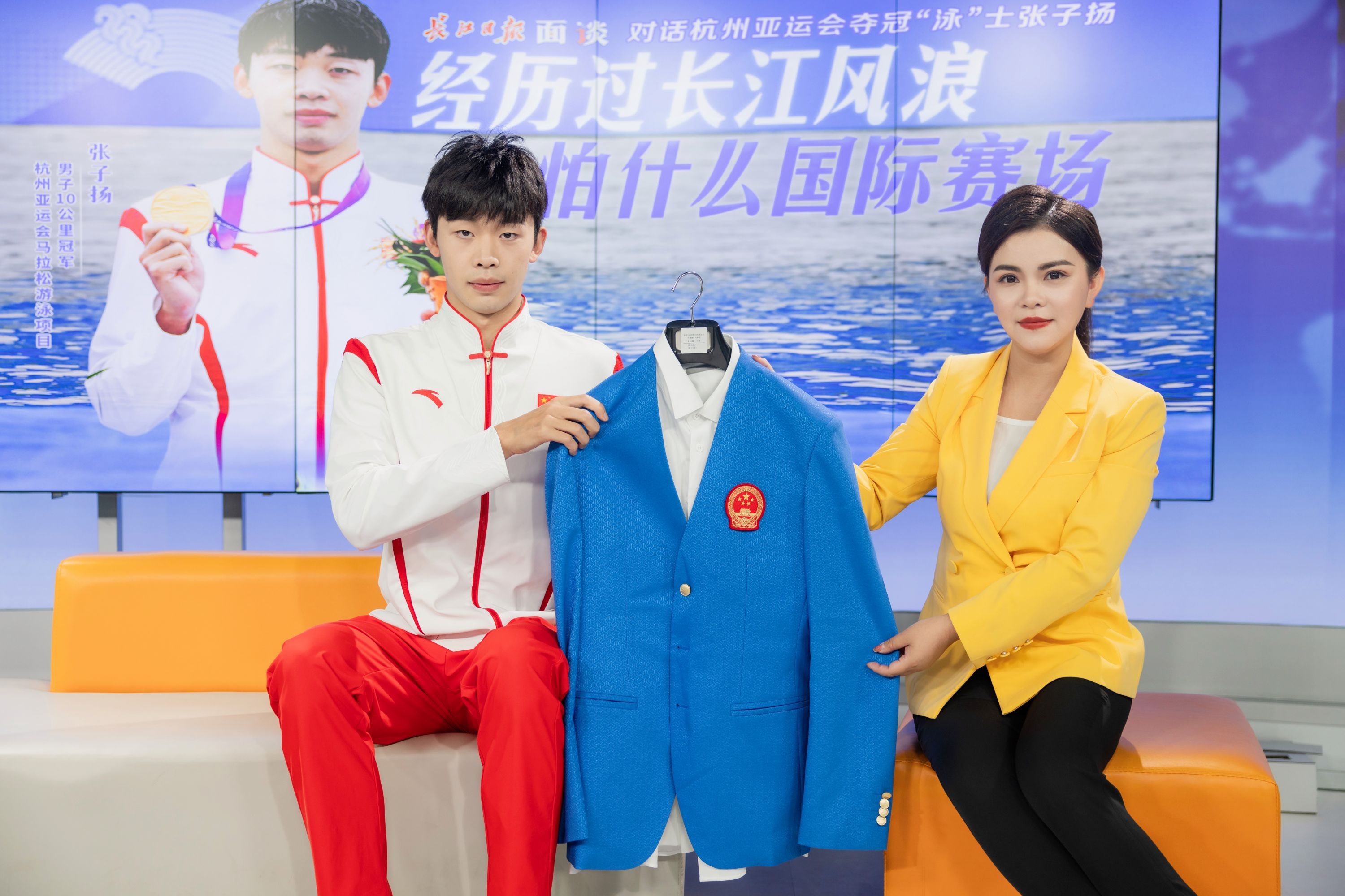 张子扬在《面谈》栏目展示亚运会入场礼服。摄影:演播中心 刘雍涛