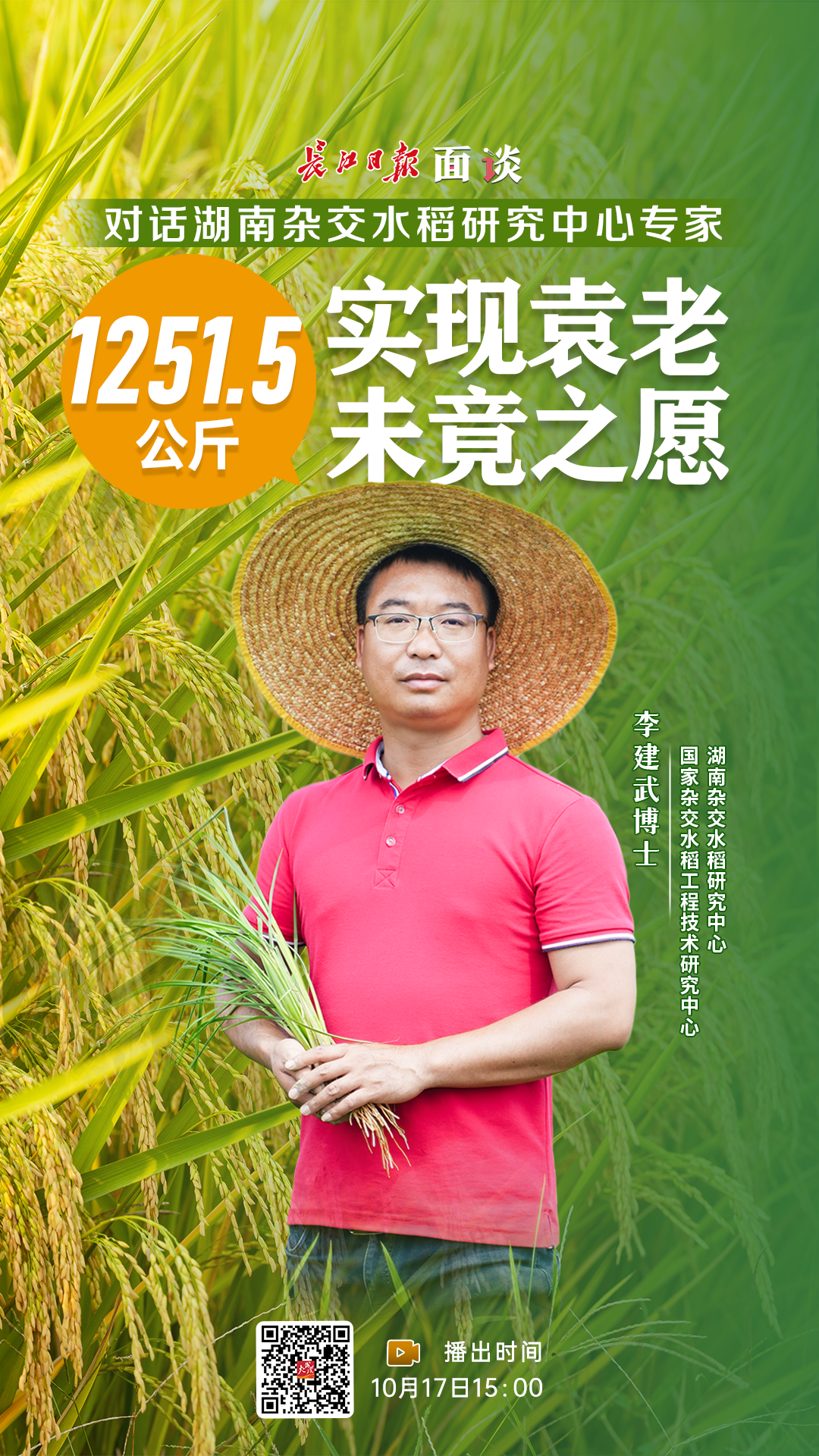 李建武:我在袁隆平院士身边待了13年。2009年,我从大学本科毕业后,一直在袁隆平院士身边做杂交水稻高产栽培技术研究和示范推广工作。回忆起来,我们的第一次见面令人终生难忘。2008年,大学即将毕业时,我要做毕业实习。我在海南三亚湖南杂交水稻研究中心南繁基地实习期间,在那边种了两亩水稻田。这两亩田,所有程序我亲力亲为。2009年3月时,水稻抽穗。有一天,袁隆平院士来到那片田旁边,他看到这片田眼前一亮。因为我种的这块田抽穗以后,穗数大,穗子又多,一看就是非常高产的长势。所以,他询问这块田是谁种的,身边的人就把我叫过去,他看到我的第一印象,评价我皮肤非常黑,黑得发亮。然后还说:“这个人为什么这么黑?肯定天天下田,肯干活肯吃苦!”最后,袁隆平院士随口问了我一些关于那块田的专业知识,我都对答如流。如今,我们做到了“1251.5公斤”,这都是因为我们站在前辈们的科研基础上。袁隆平院士带给我的精神给养会伴随我一生。