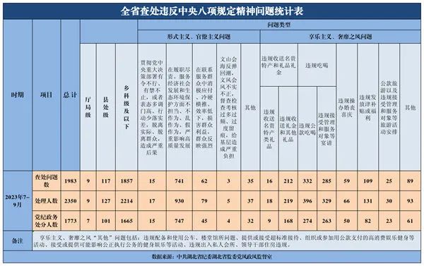2023年第三季度,全省查处违反中央八项规定精神问题1983起,批评教育帮助和处理2350人,其中,党纪政务处分1773人。