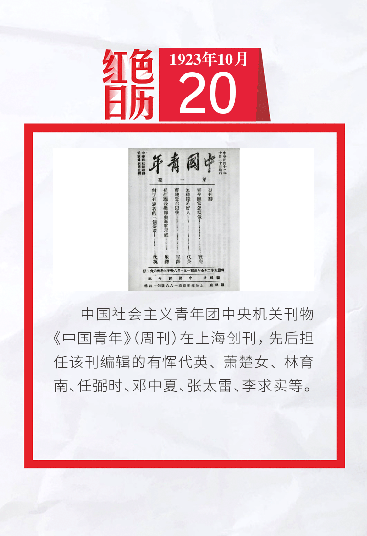 1923年的今天,中国社会主义青年团中央机关刊物《中国青年》(周刊)在上海创刊|红色日历 ©原创 2023-10-20 10:08 0 图片来源:《中国青年》第一期中共一大纪念馆微信公众号 整理:朱佳琪 设计:陈昌 制作:张莉 【编辑:戴容】