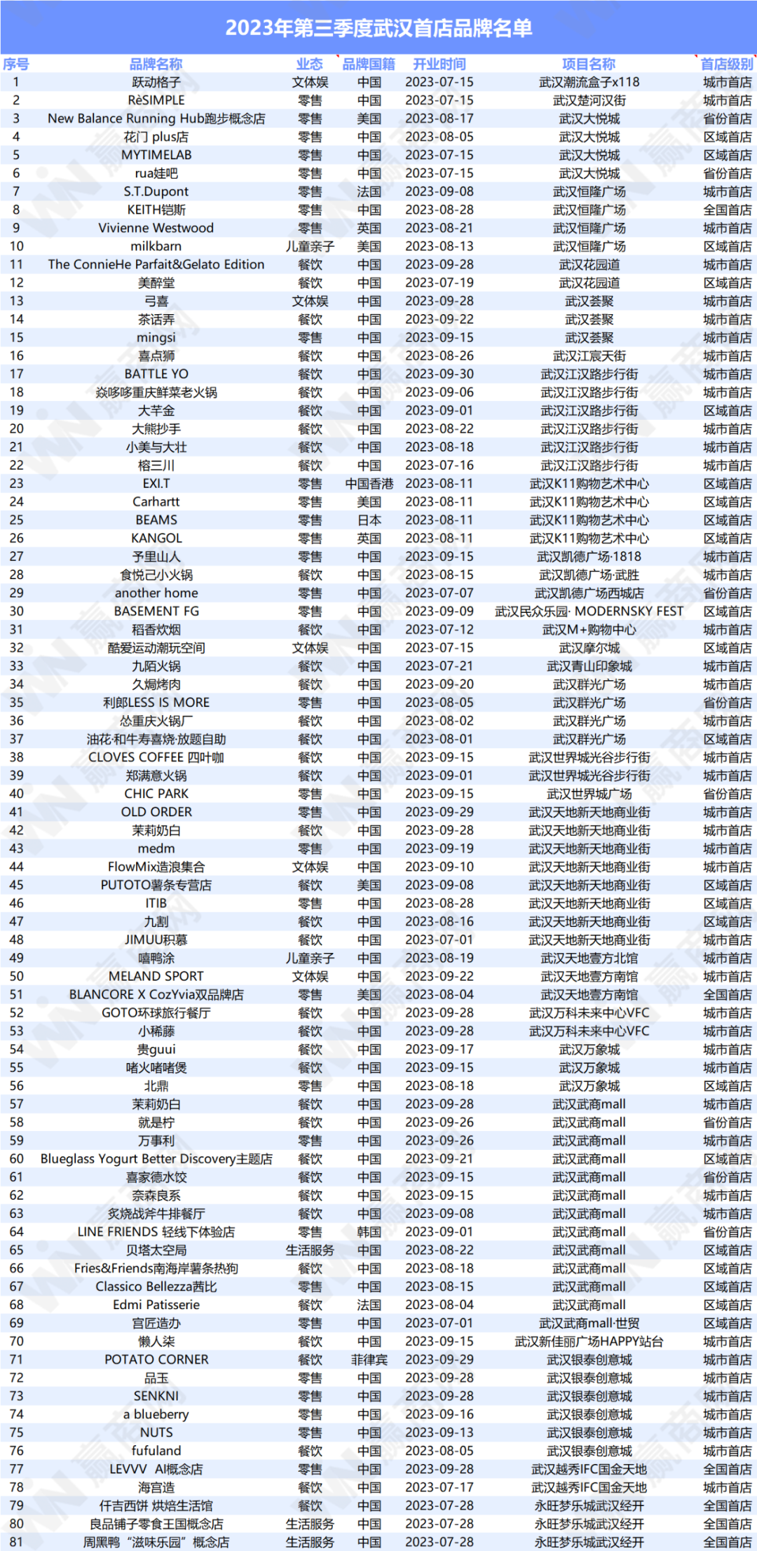 据赢商大数据不完全统计,今年三季度武汉新增首店81家,其中,全国首店有6家,区域首店22家,湖北及武汉首店53家。