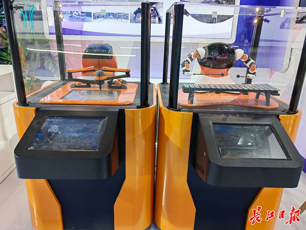 武汉需要智能技术有限公司展台前,两个机器人互动教育装备正在“打擂”:一个会写字,另一个会演奏钟琴。