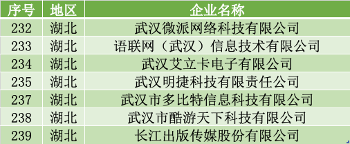 湖北此次入选的8家企业有7家在武汉:武汉微派网络科技有限公司、语联网(武汉)信息技术有限公司、武汉艾立卡电子有限公司、武汉明捷科技有限责任公司、武汉市多比特信息科技有限公司、武汉市酷游天下科技有限公司、长江出版传媒股份有限公司;湖北3个入选项目均来自在汉企业:武汉微派网络科技有限公司的《贪吃蛇大作战 》游戏精品打造与出海战略、长江少年儿童出版社(集团)有限公司的“百年百部”经典书系对外翻译工程、语联网(武汉)信息技术有限公司的国际影视文化译制服务平台。