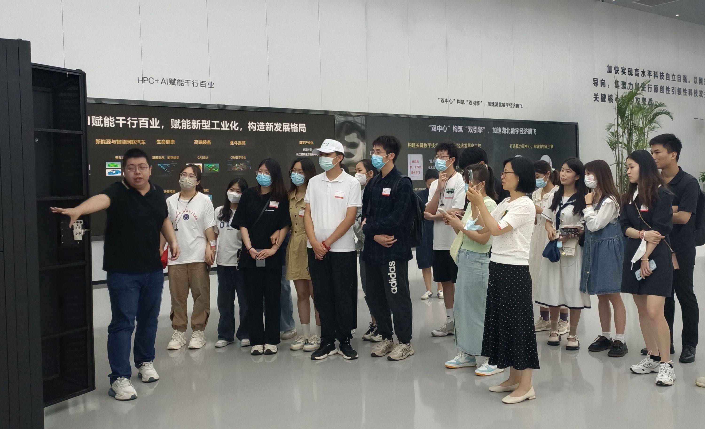 工作人员在武汉超算中心展厅内,向参观者介绍超算中心设备及功能。通讯员供图