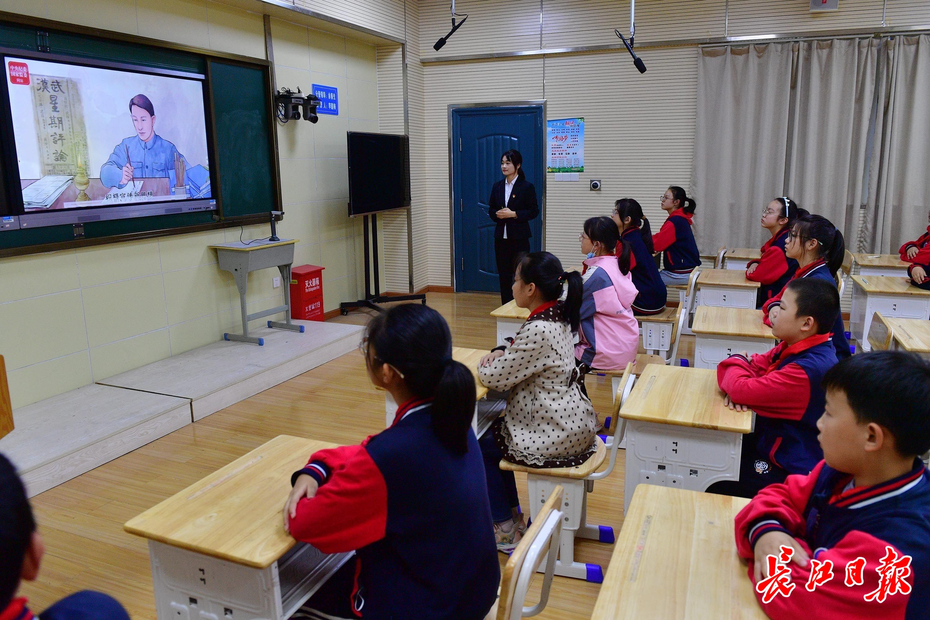 蔡榨小学六年级学生在思政课上学习蔡以忱的清廉故事。长江日报记者 李永刚 摄