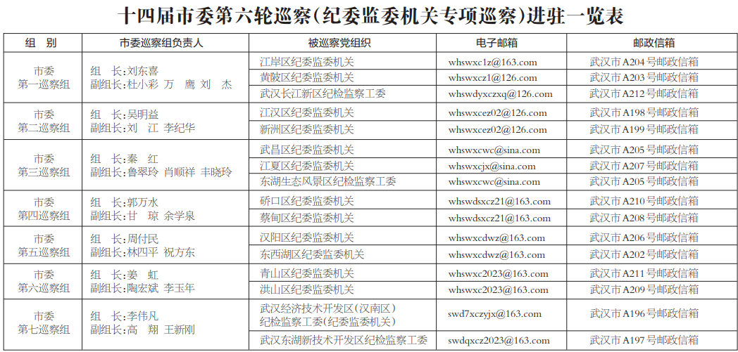 根据省市委统一部署,本轮巡察将对武汉东湖新技术开发区、武汉长江新区、东湖生态风景区,江岸区、江汉区、硚口区、汉阳区、武昌区、青山区、洪山区、蔡甸区、江夏区、东西湖区、武汉经济技术开发区(汉南区)、黄陂区、新洲区纪委监委机关(纪检监察工委)共16个单位开展专项巡察。工作时间1个月左右,巡察期间设立邮政信箱、电子邮箱,主要受理反映被巡察纪委监委领导班子及成员、派出派驻或下一级纪检监察机构主要负责人和纪检监察干部问题的来信。巡察组受理信访时间11月17日截止。