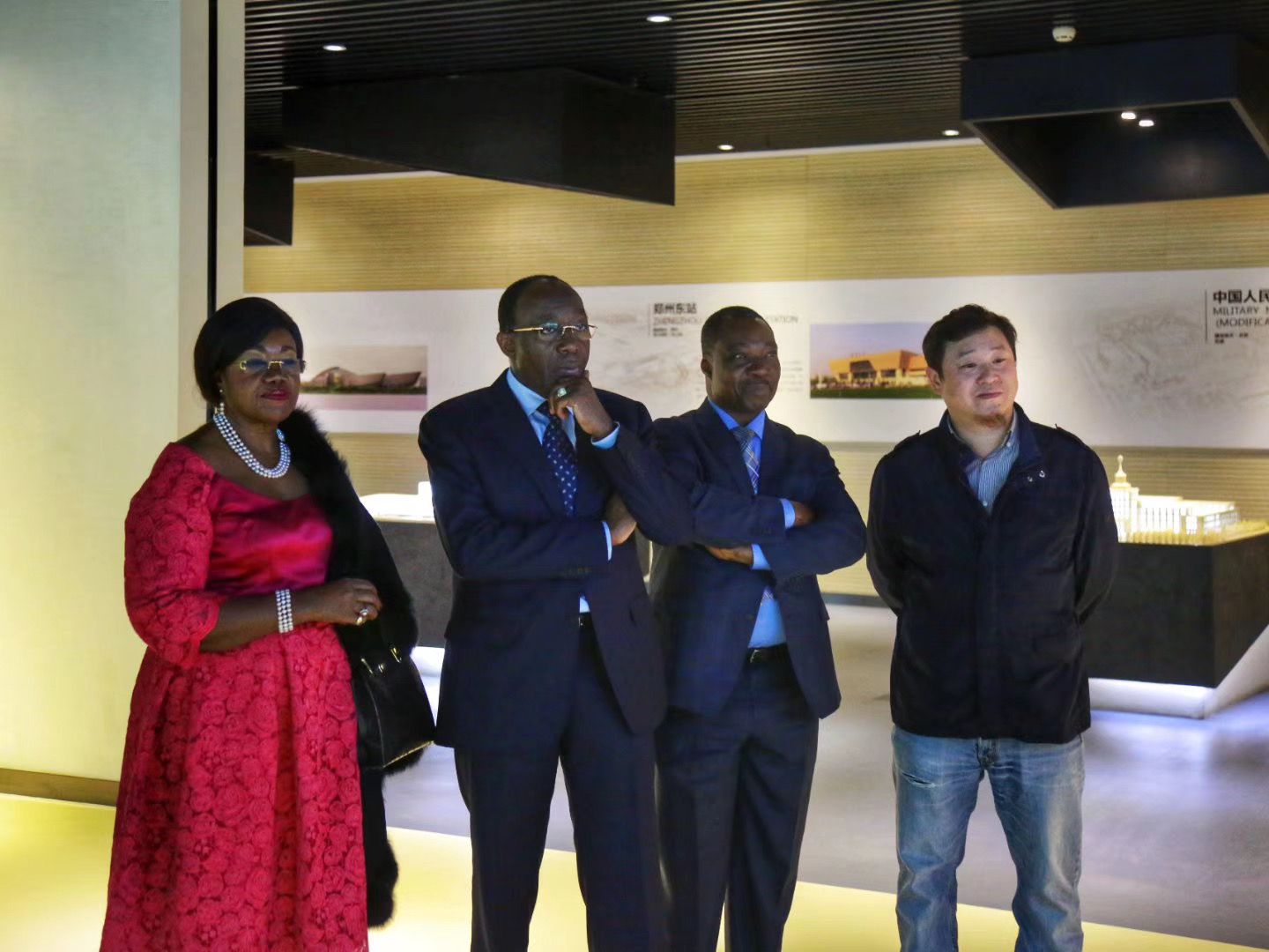 2018年10月,唐文胜(右一)、达米安(右二)和时任刚果(金)总统特使雷蒙・奇班达夫妇等专门来武汉,交流验收中南院的图纸。