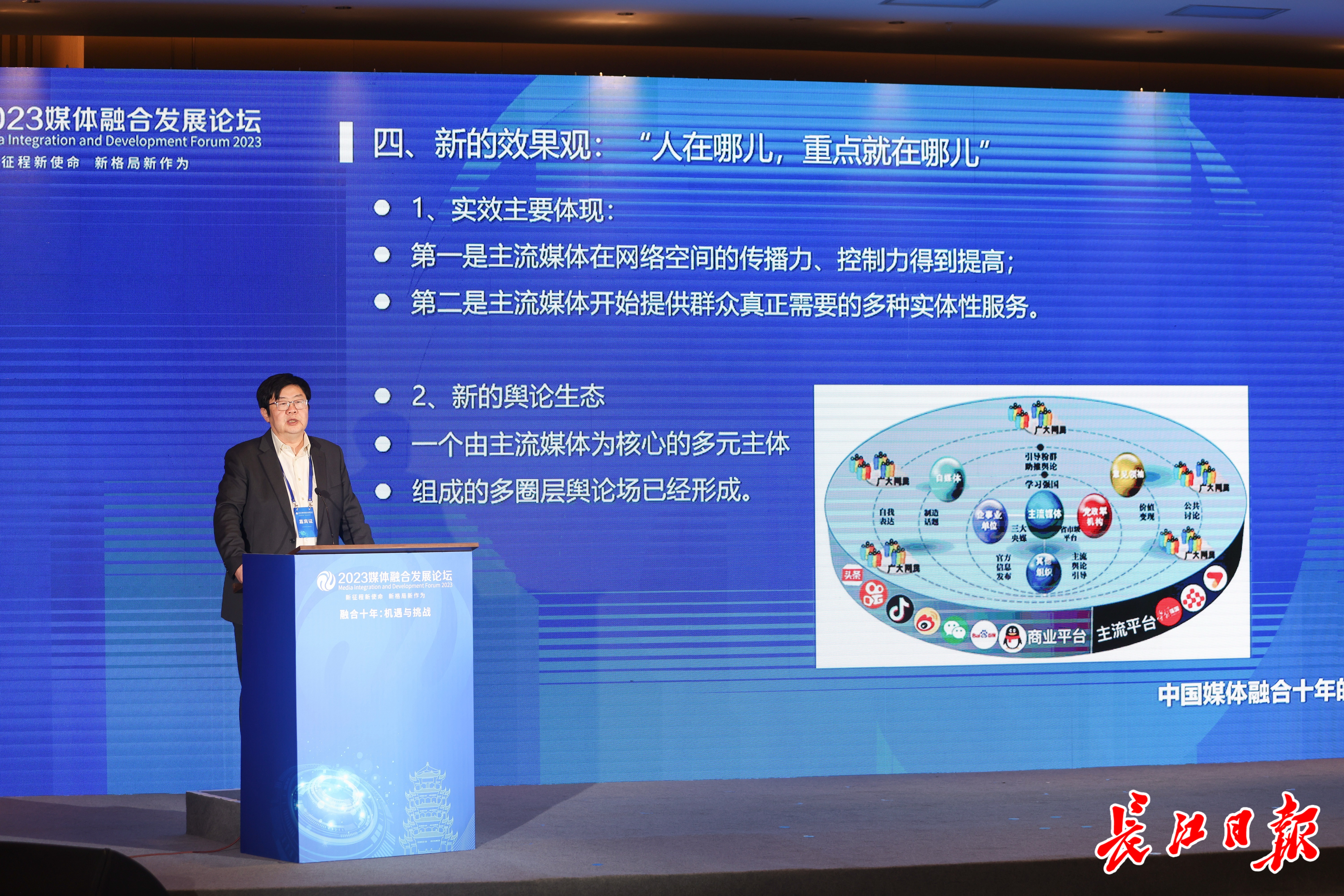 从新的功能观看,新型主流媒体具有主流舆论阵地、综合服务平台和社区信息枢纽等“三大功能”;从新的效果观来看,十年融合发展,我国社会形成了新的舆论生态,产生了一个由主流媒体为核心的多元主体组成的多圈层舆论场。