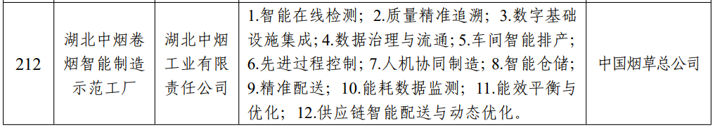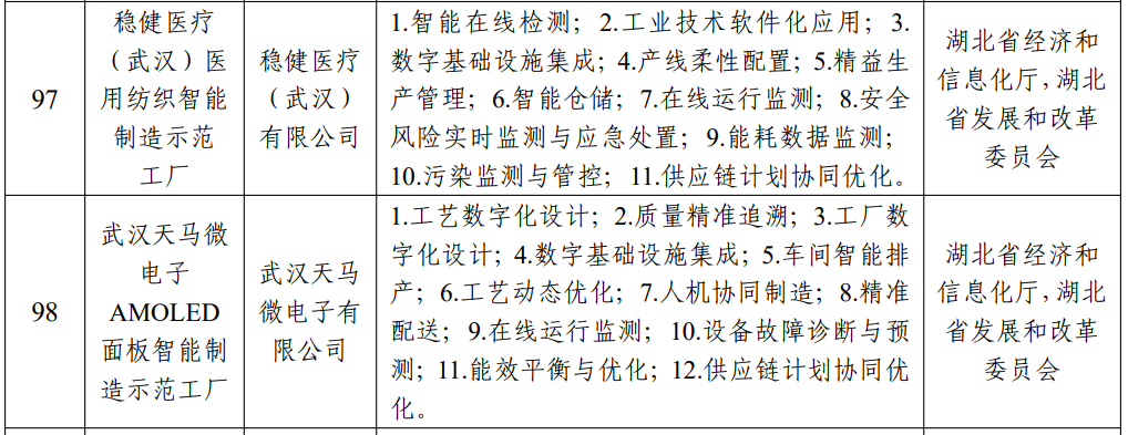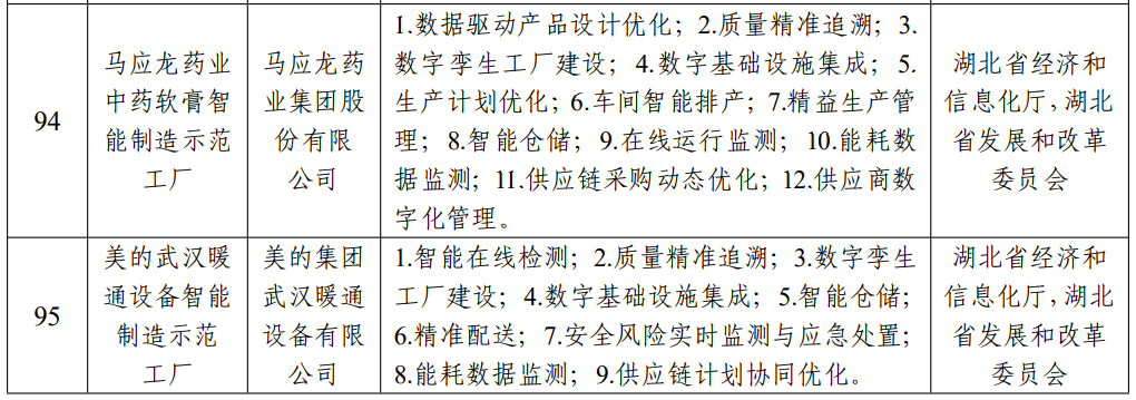 此次有212家企业入围2023年度智能制造示范工厂揭榜单位名单,其中包括8家在汉企业,其揭榜项目有:马应龙药业中药软膏智能制造示范工厂、美的武汉暖通设备智能制造示范工厂、稳健医疗(武汉)医用纺织智能制造示范工厂、武汉天马微电子AMOLED面板智能制造示范工厂、东风新能源汽车智能制造示范工厂、岚图新能源汽车智能制造示范工厂、中建钢构武汉智能制造示范工厂、湖北中烟卷烟智能制造示范工厂。具体名单如下: