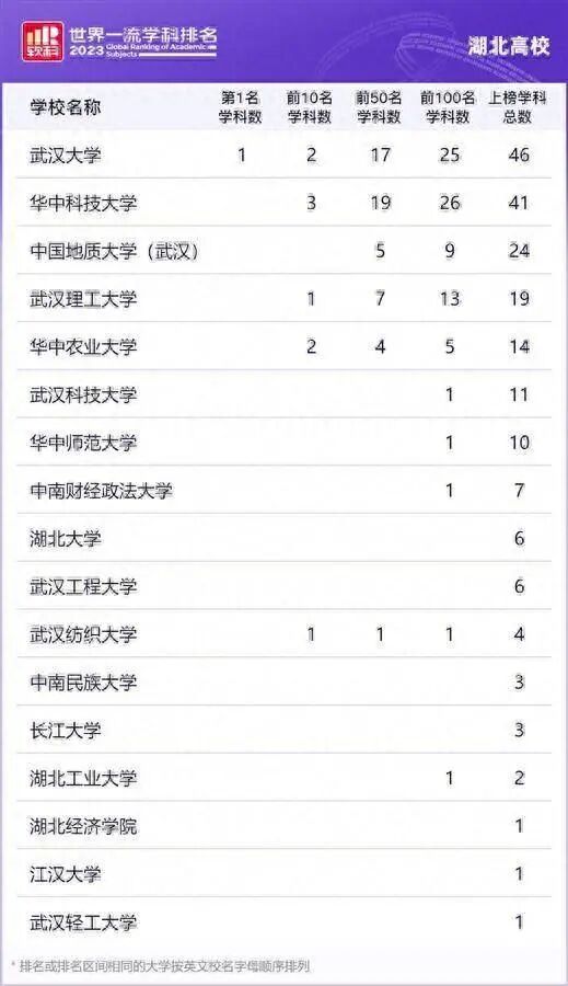 从各高校的上榜学科总数来看,武汉大学上榜46个学科、华中科技大学上榜41个学科,领跑全省。上榜学科数在20个以上的有中国地质大学(武汉)(24个)。上榜学科数在10个以上的有武汉理工大学(19个)、华中农业大学(14个)、武汉科技大学(11个)、华中师范大学(10个)。