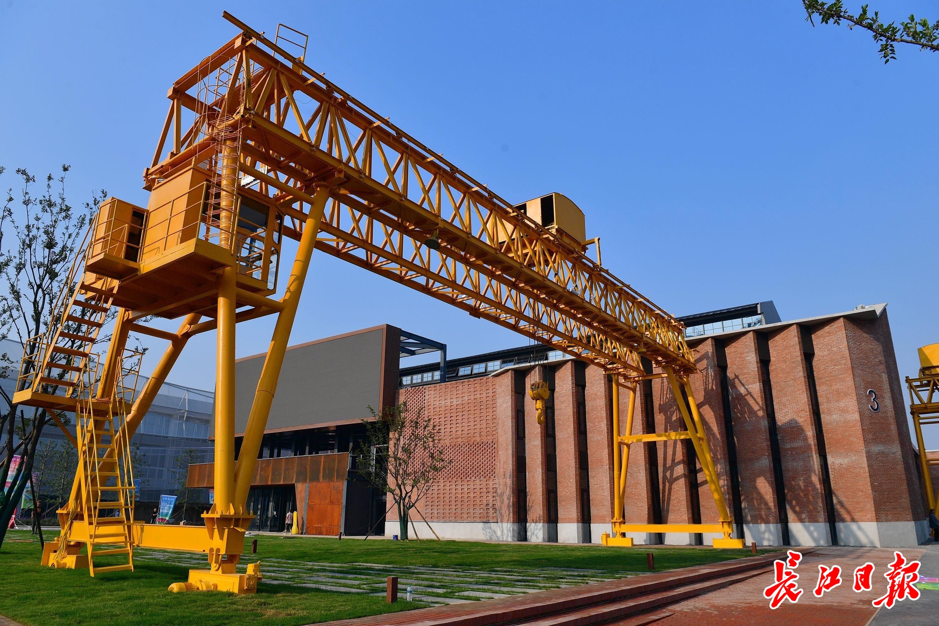 园区设计了一处露天台阶,登高可俯瞰园区,拍到车间厂房改建的展馆、轨道龙门吊等全貌。除了白天,夜间建筑会亮起灯光秀,别有一番景致。