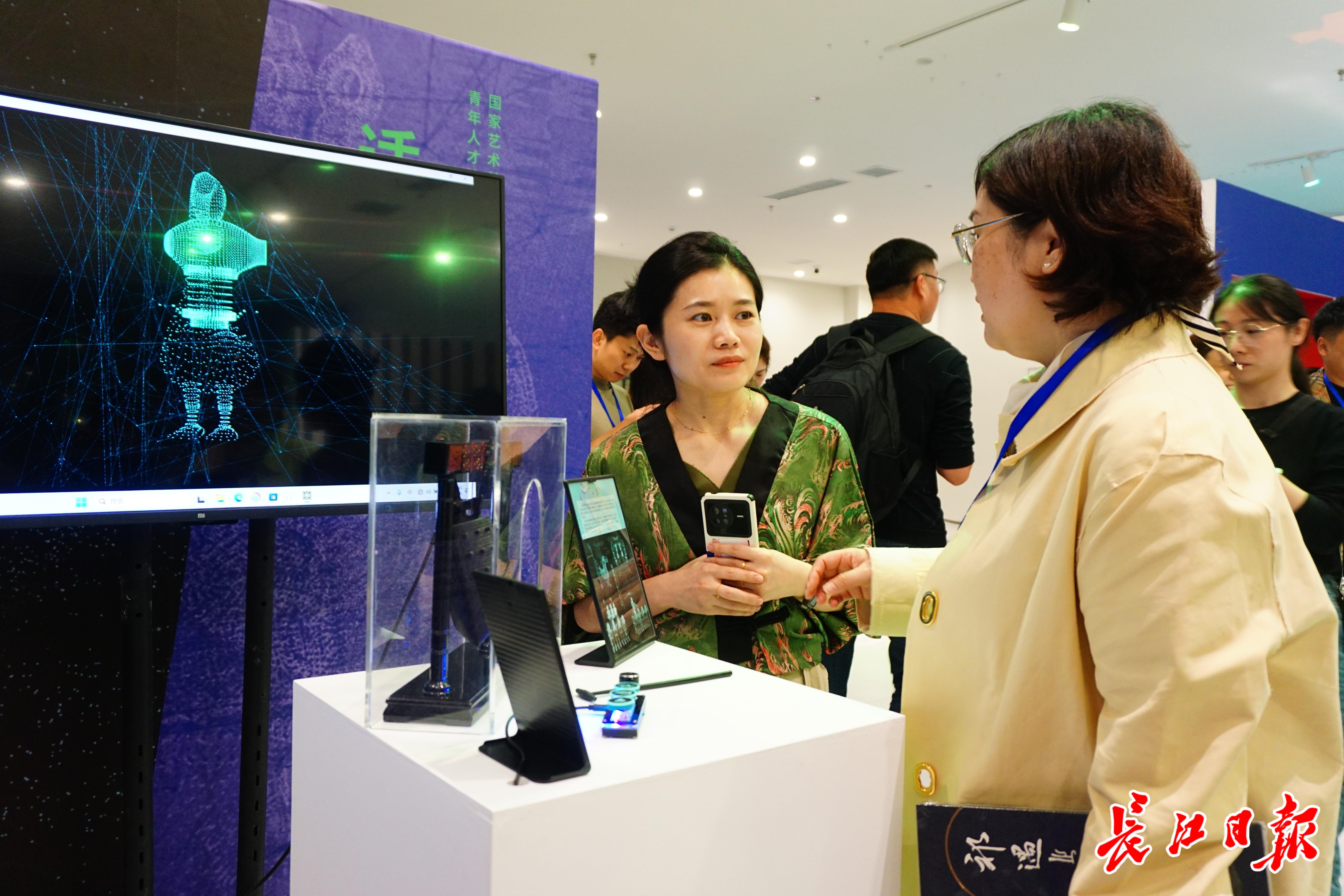 音画互动影像装置《适遇铜青》引来不少观众的好奇。屏幕上,粒子光点跟随着古乐的节奏韵律,时而汇聚,时而分散。艺术家罗雪拿起小锤,轻轻敲击手边的小编钟,伴随着一声清脆的钟声,已经聚成编钟样的粒子光点迅速波动又恢复成原样。