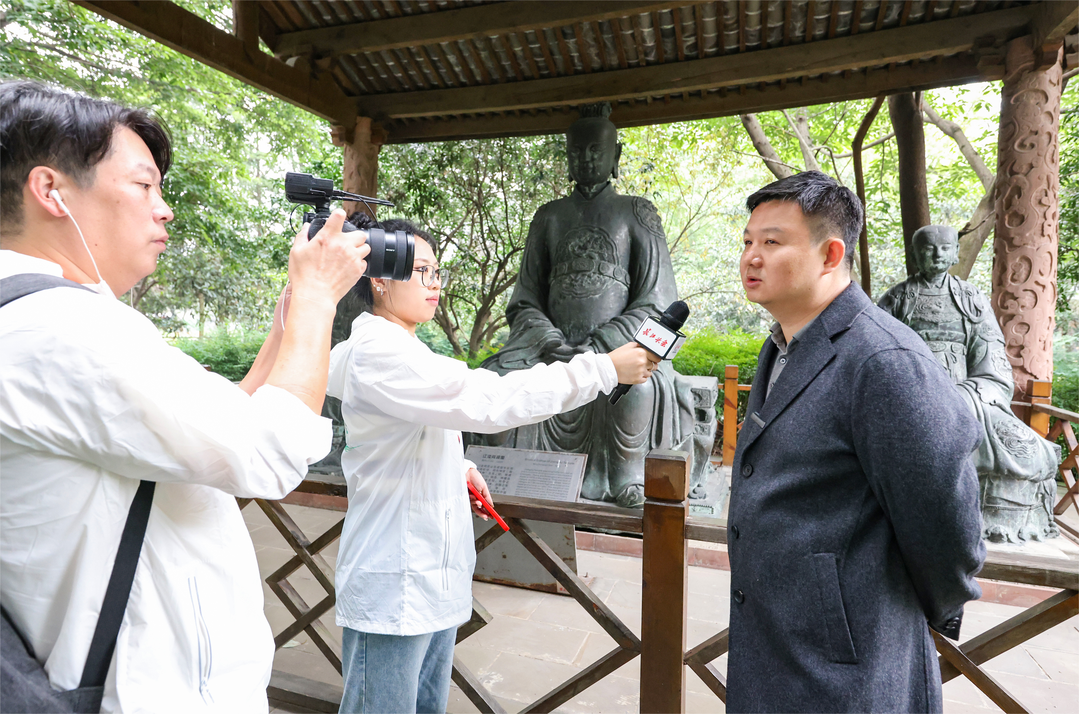四川博物院党委书记向和频为探访团讲解江渎神像及其文化渊源。王筝 摄