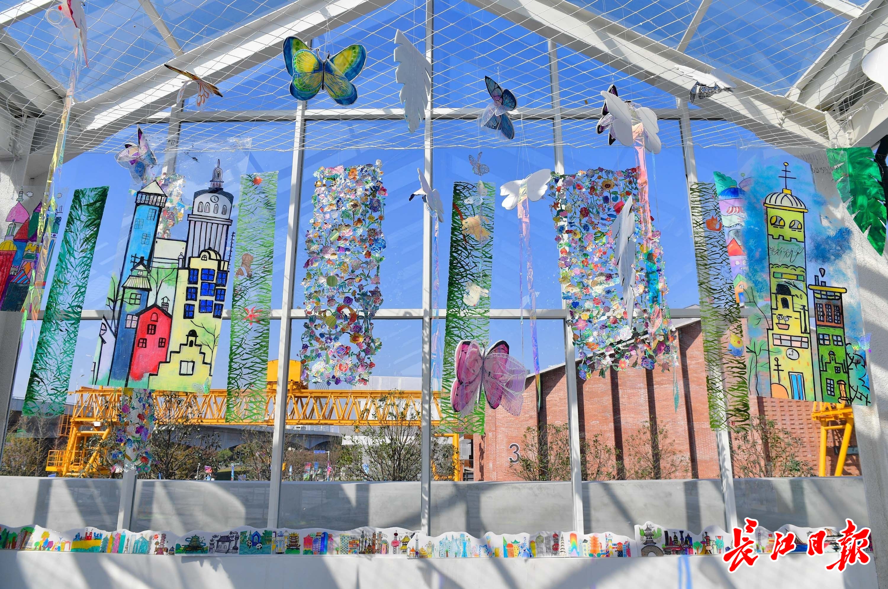 5号展馆二楼,有一个能透出蓝色天空的白房子屋顶,是充满天马行空和各种童趣的《童创·2050未来城》作品展,联合武汉多所中小学、200余名学生共创,以儿童视角构建自己对未来城市的美好想象。孩子们的创意手工和画作吊在空中,飘在空中,充满浪漫色彩。非常推荐周末家长们带上孩子来打卡。