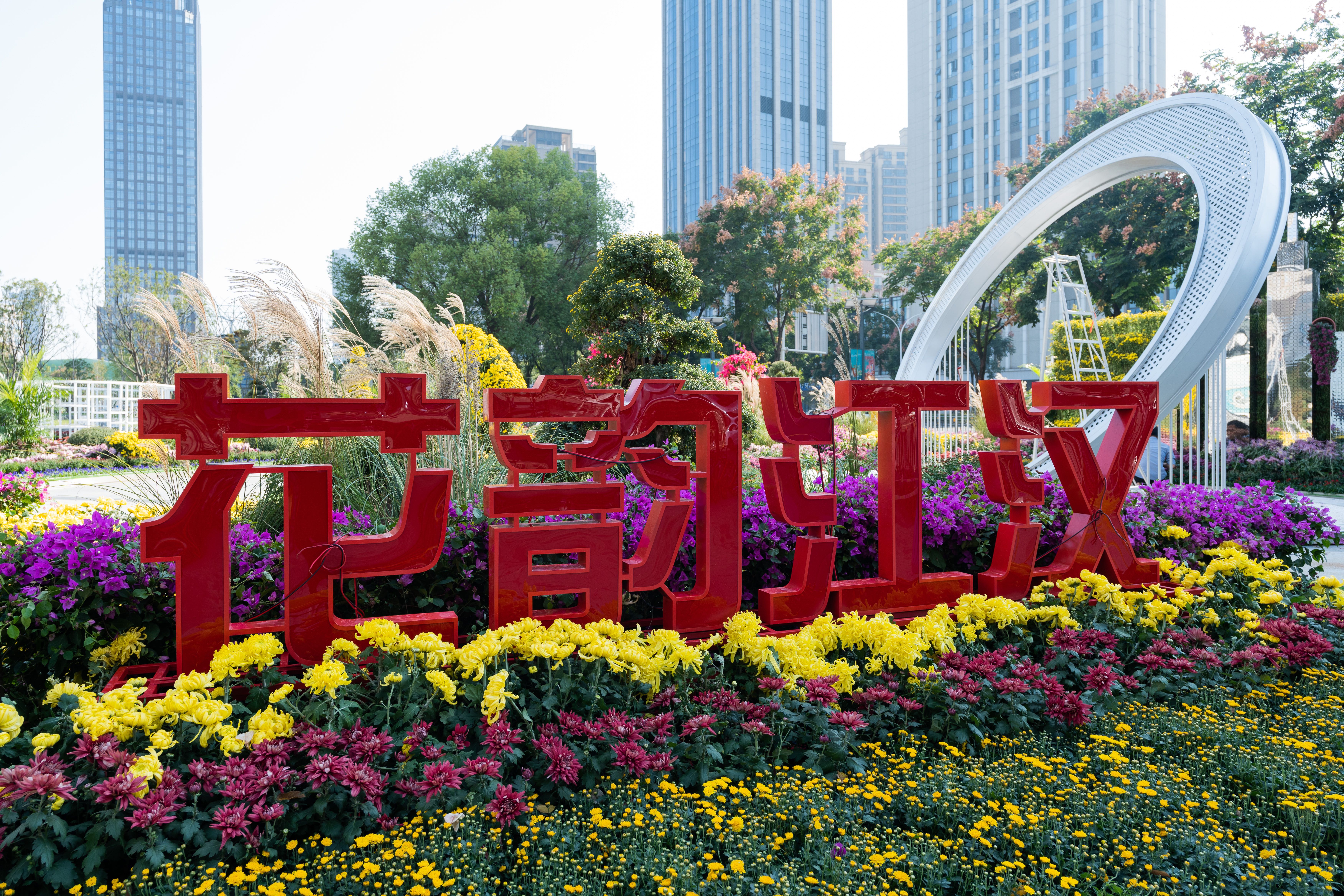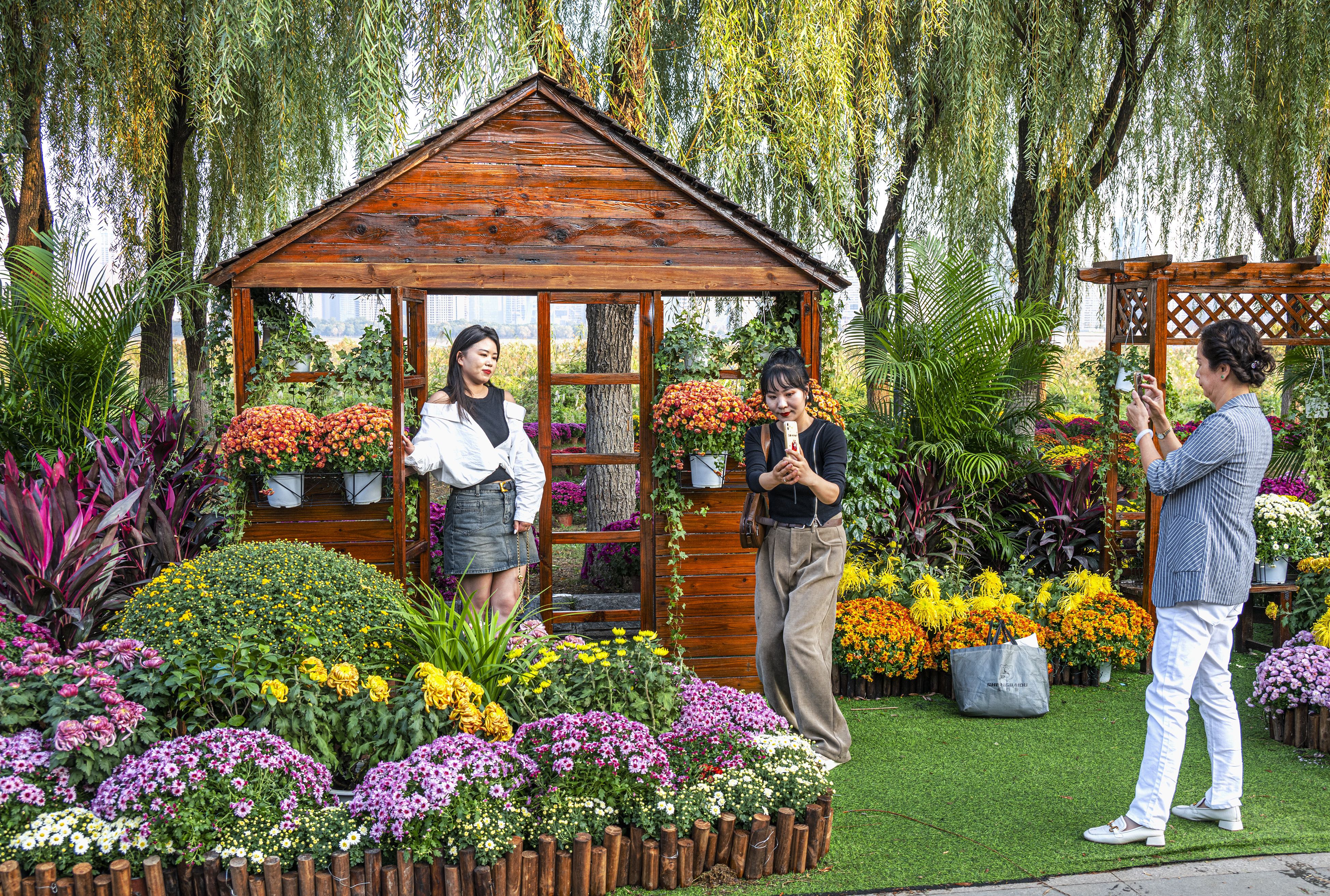 汉口江滩风帆广场,各色菊花组成的园林小景吸引市民打卡。 邹幼勤 摄