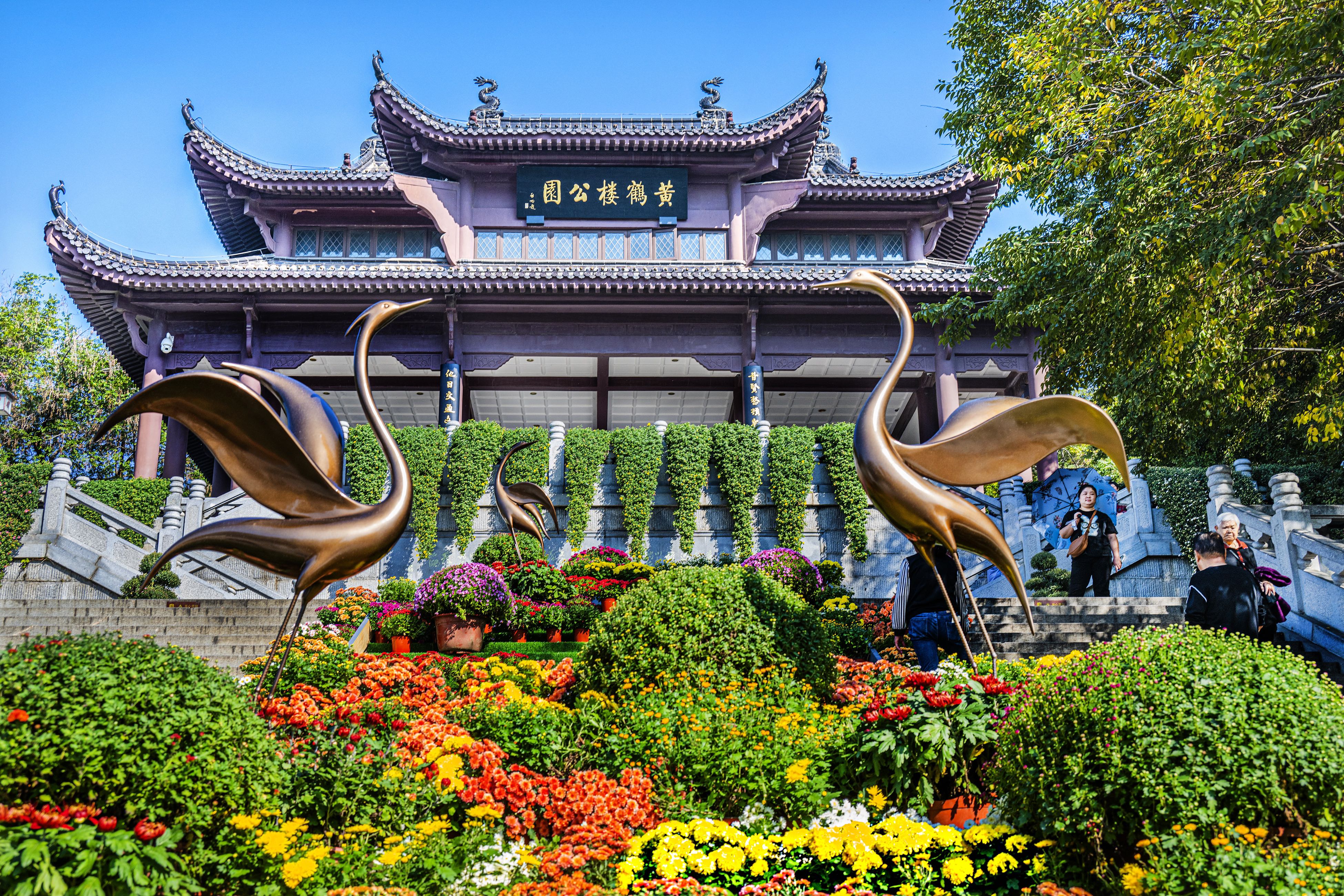 白云黄鹤,菊韵飞扬,千年名楼换上多彩新装。来到黄鹤楼公园东门,只觉花香浮动,清新雅致的菊花引人入胜。或沿花路拾级而上,不同色块的菊花宛若漂浮的彩云,簇拥黄鹤归来;或徜徉花海之间,各色品种菊、盆景菊点亮绚烂秋日,为黄鹤楼更添古韵。依托东门牌坊、亭廊等景观,以古代名画为蓝本布置的菊花古意小景意境悠远。