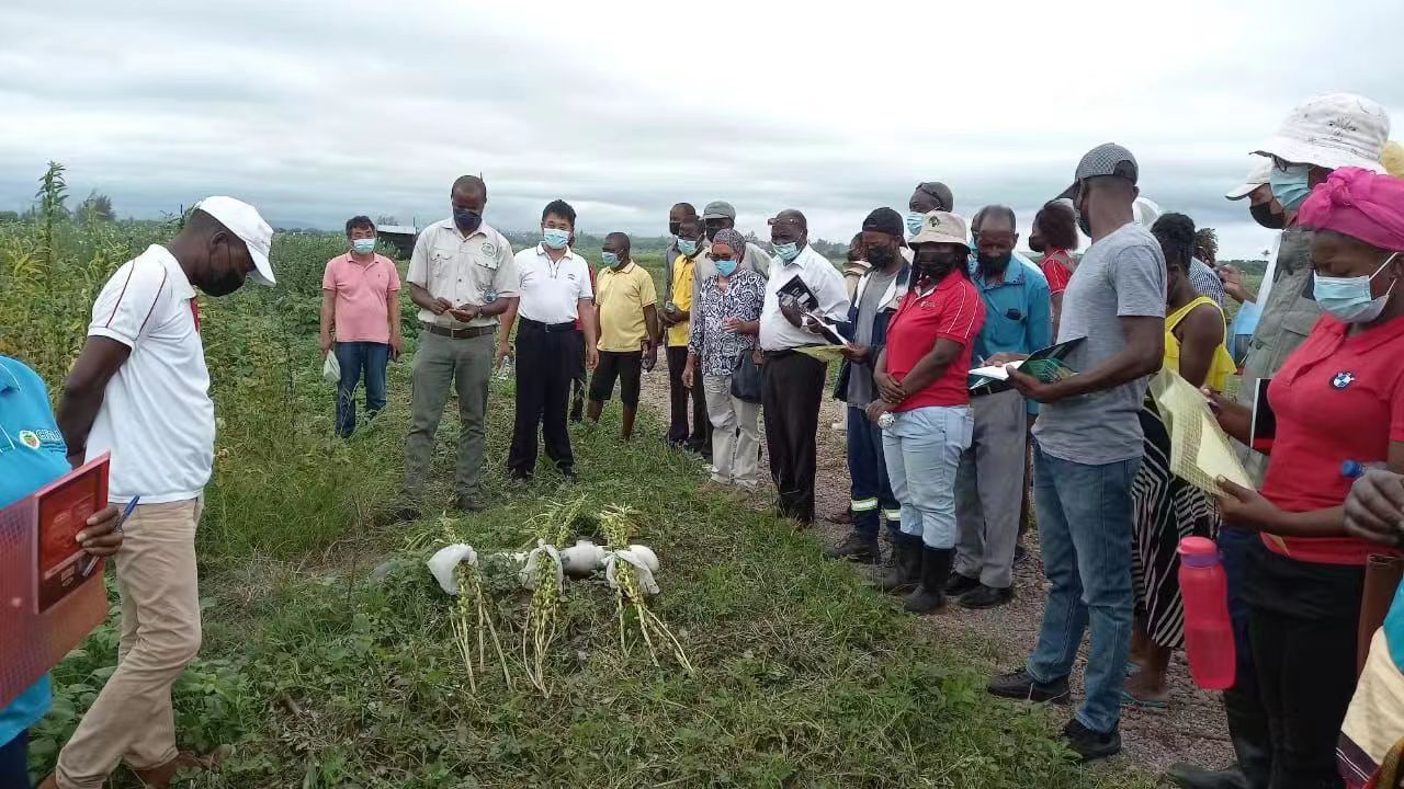 中国农业技术专家在莫桑比克田间为当地的农业技术人员和农户做示范种植芝麻对比分析。