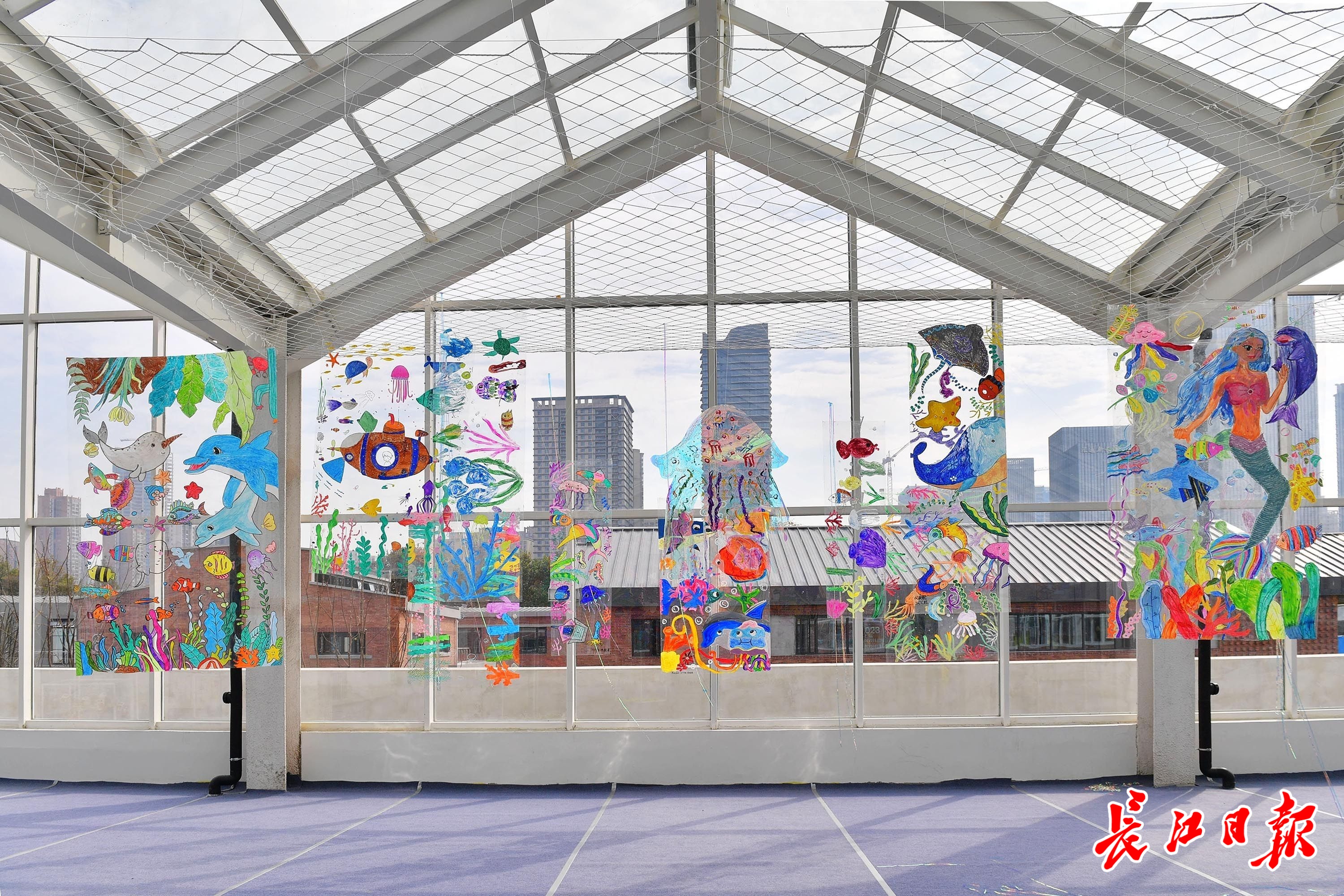 “童创2050未来城”就在5号馆二楼,这里是一个巨大的阳光房,孩子们的所有画作用透明板悬挂,在阳光的照耀下,反射出五彩斑斓,大面积的高饱和度色彩极具视觉冲击力。