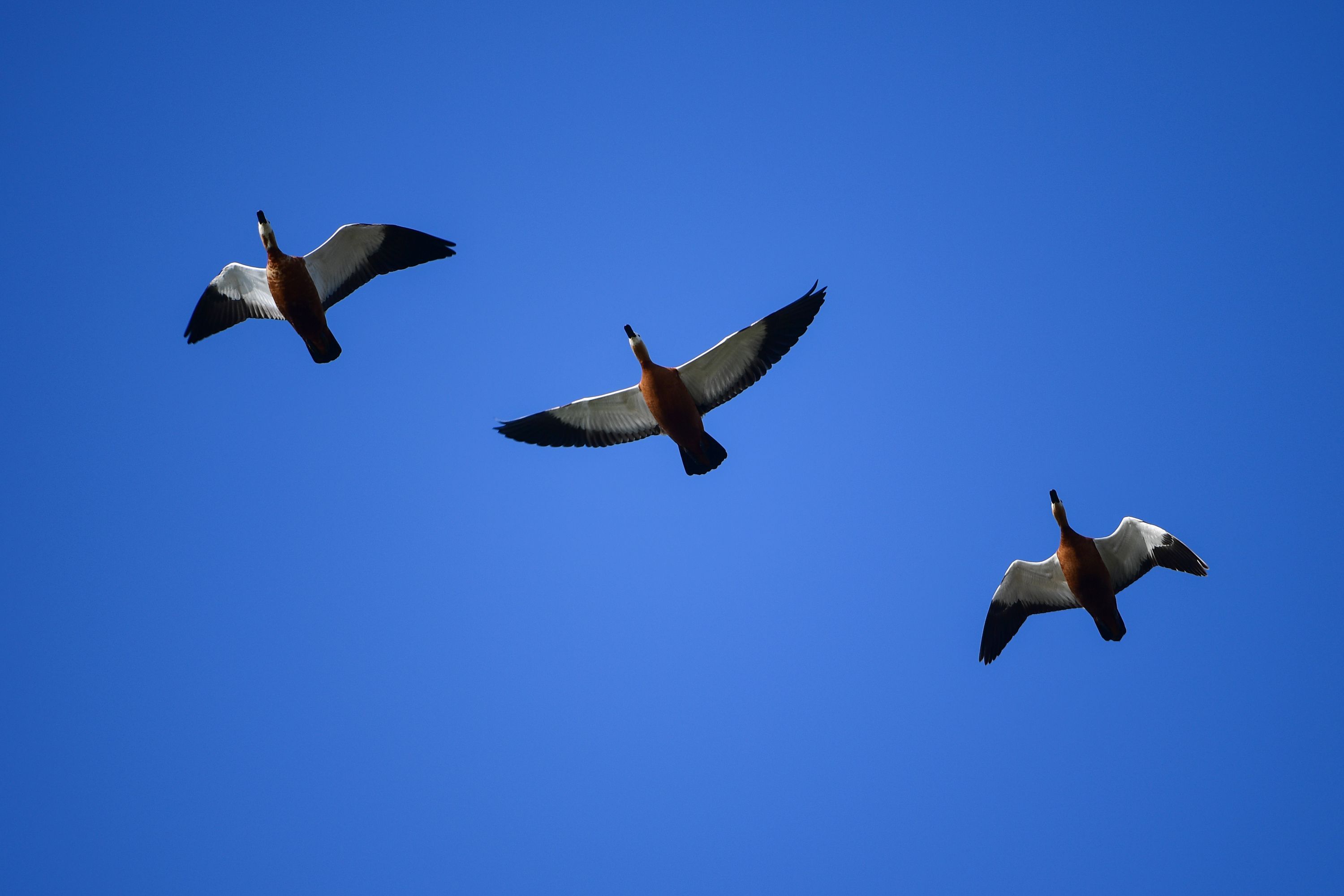 在武汉沉湖国际重要湿地自然保护区, 一队赤麻鸭(国家二级保护动物)在空中飞翔。 史伟 摄