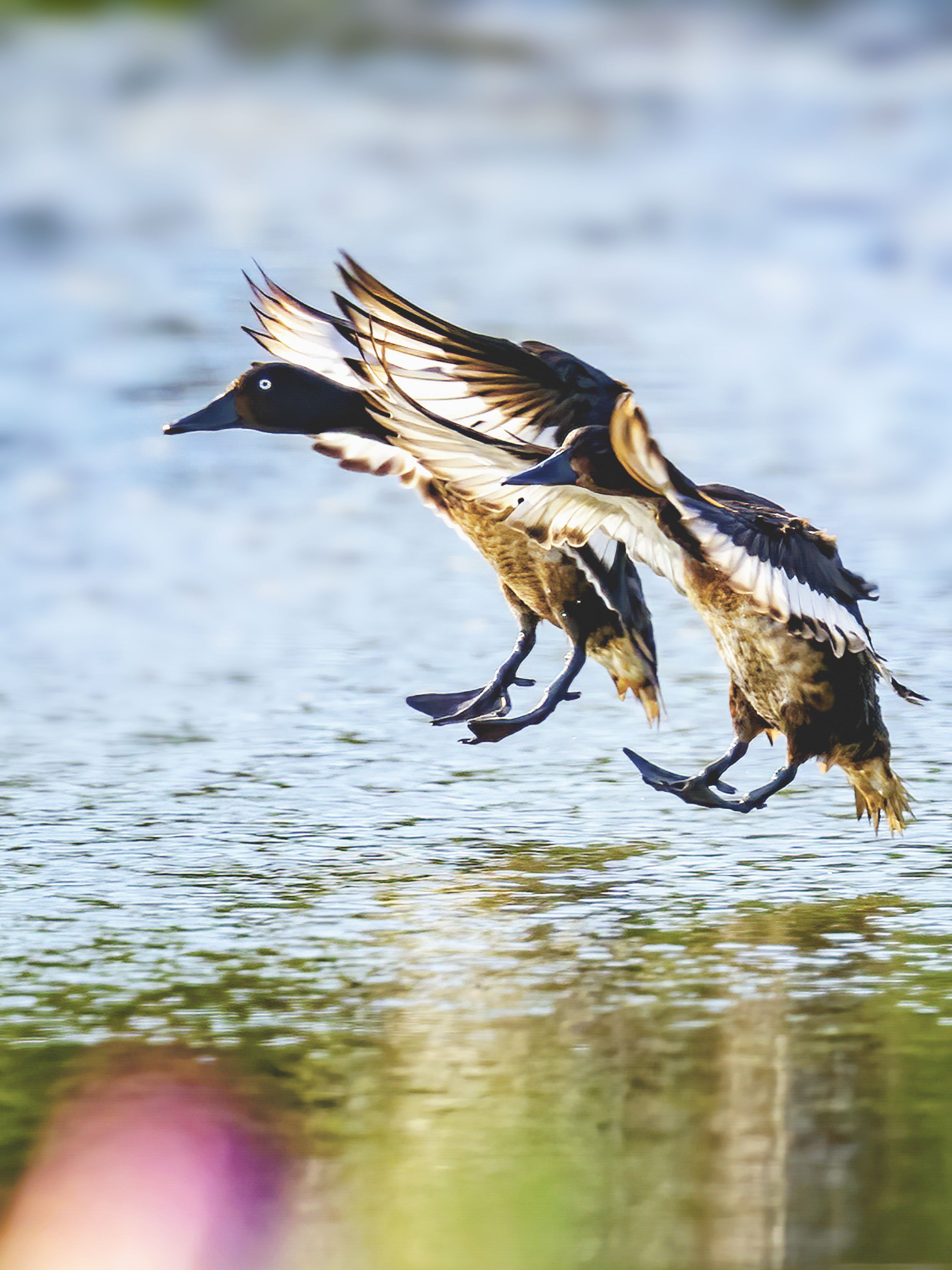 “这些都是青头潜鸭,目测有二三十只。”明亮说。笔者透过高倍望远镜看到,这些野鸭果然有着标志性的青头白眼、翼下白羽。