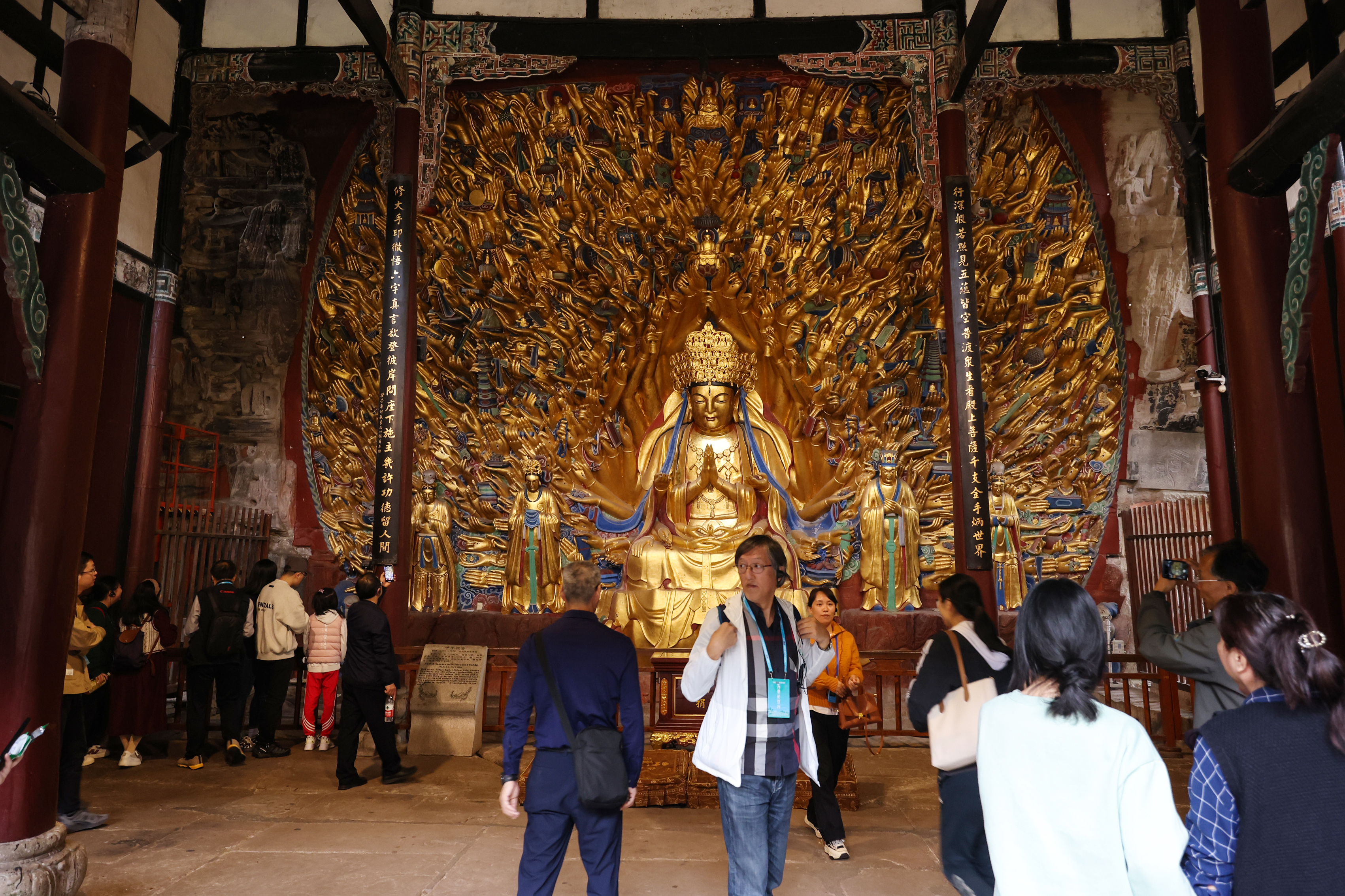 在宝顶山大佛湾南崖88平方米的石岩上,一龛金碧辉煌的千手观音,让游客纷纷惊叹“震撼”。