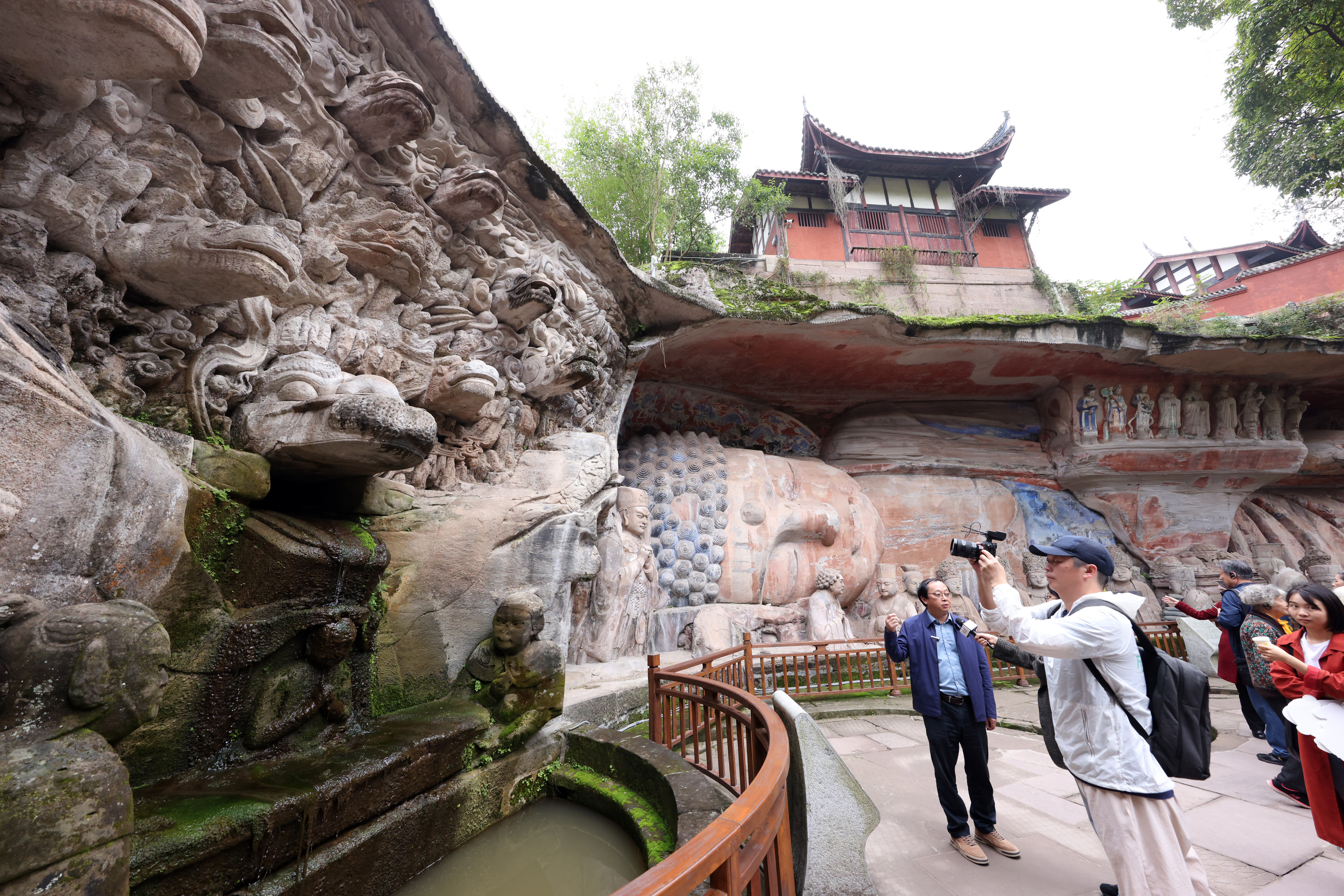 大足石刻研究院副院长刘贤高向探访团介绍,卧佛像右边山崖本是山水汇集出口处,经年流淌不息。工匠们巧妙利用天然地形,结合佛经中两龙吐冷暖二泉为刚出生的释迦洗礼的故事,运用中国吉祥之数9,打造了“九龙浴太子图”。通过一条暗道,使水有节制地经最大龙嘴缓吐,变成沐浴初生释迦太子欢乐的水流,涓涓细流蓄满下面小池,再通过卧佛像前弯弯“九曲黄河”状排水沟排出。