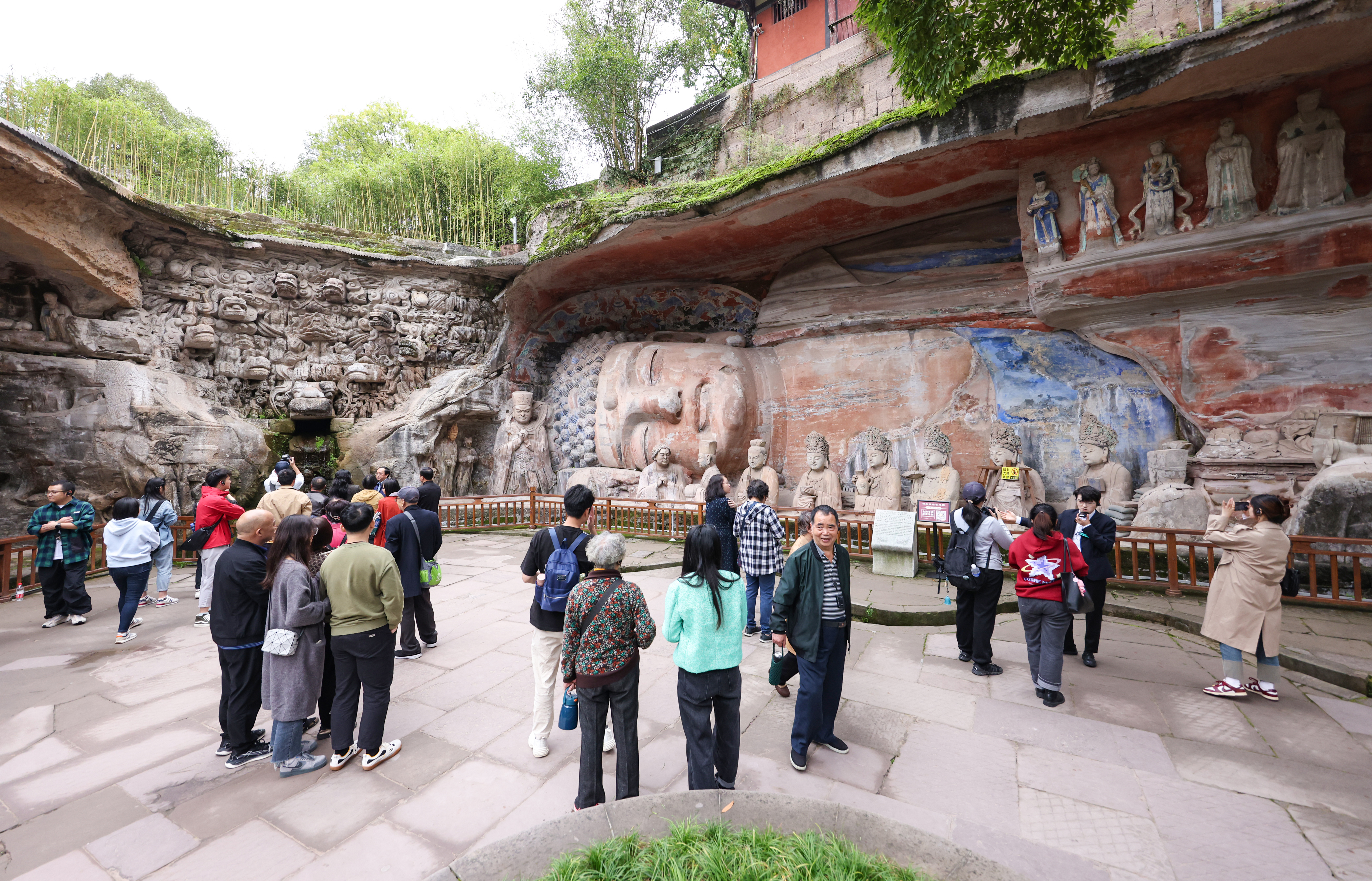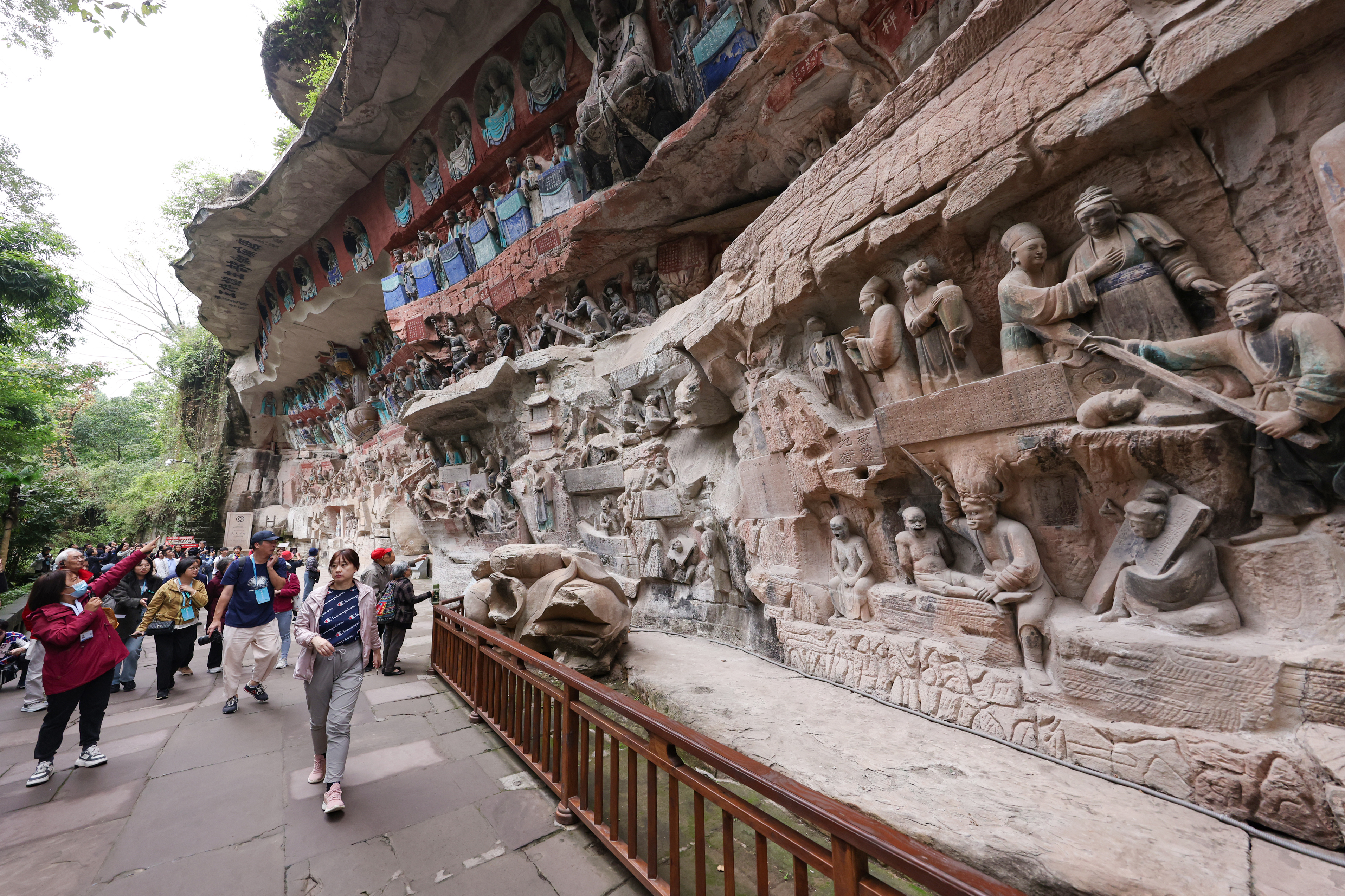 “将释迦出生和涅槃的场景置于一处引人深思,同时解决排水问题,还将佛教内容中国化了。”探访团员武振慧赞叹道,大足工匠的巧夺天工令人叹为观止。